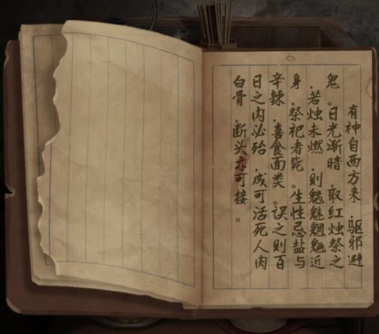 进门后查看左边的柜子上拿到旧衣服,旁边的书上是剧情没解谜,出门对方桌上的热水瓶使用衣服获得湿衣服,回到左边房间对镜子使用湿衣服获得密码324157,这个密码还是很好看出来的,但是我们并没有需要数字密码的地方,而且这个没有6所以不是顺序密码,那么就只有一种可能了,是次数。
