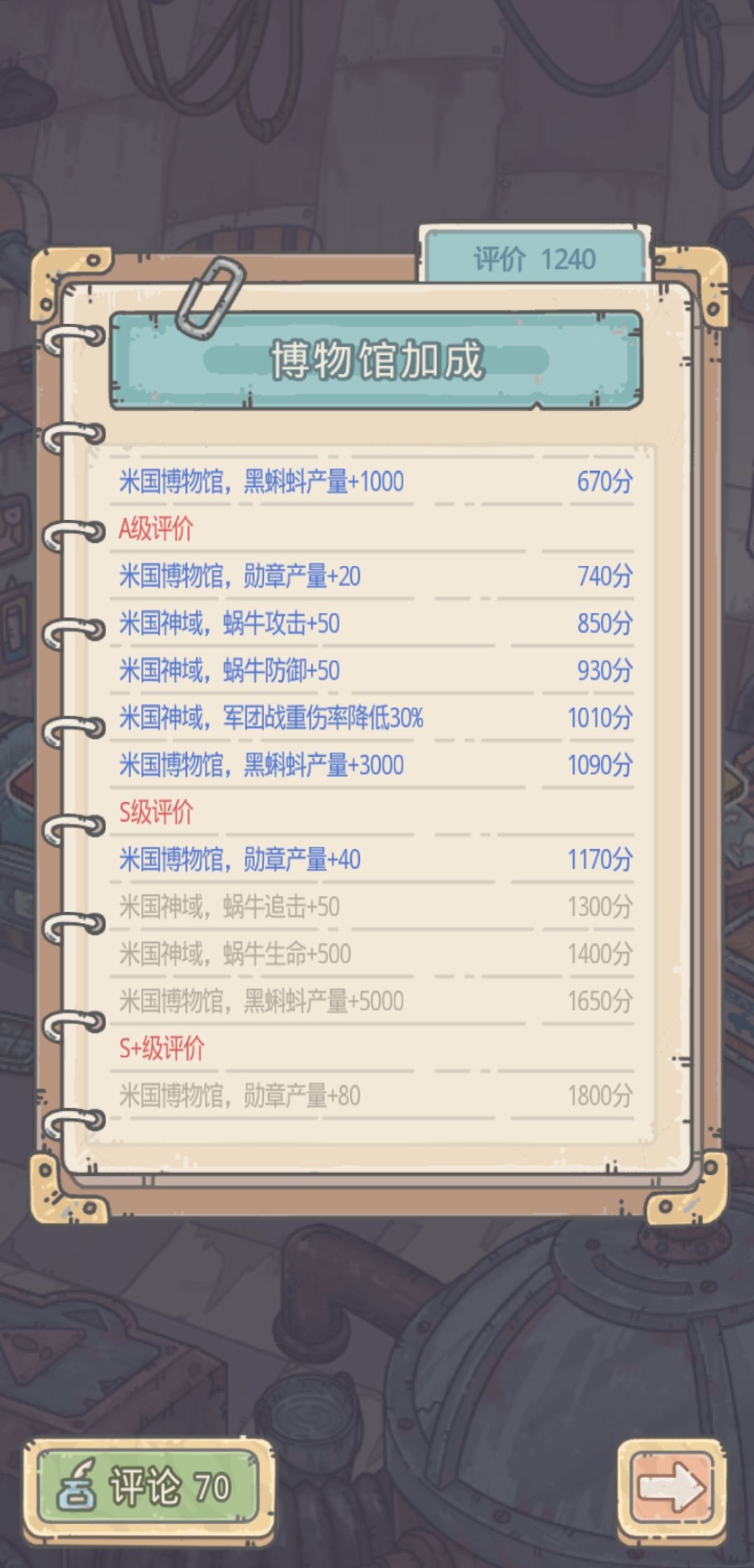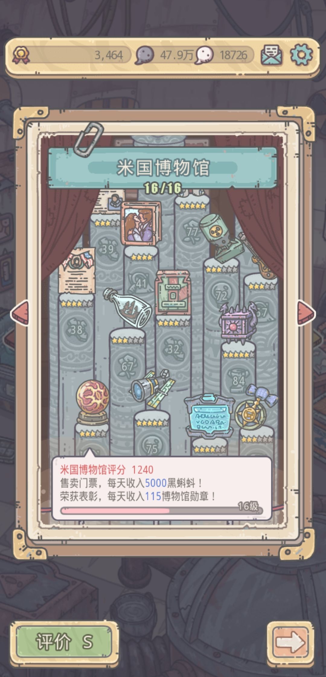 我今天想明白一个道理。对于上了s级的博物馆来说,1170分和1799分没什么区别,所以在保证s评级的基础上,完全可以这么玩。这是我的米国博物馆,我把我所有在米国博物馆生效的橙紫贵全装上了,很多都乱装的,比如说米国博物馆技能橙贵很多都是人气的,但人气格子不够,我就塞在信仰里。只要有技能就行了。