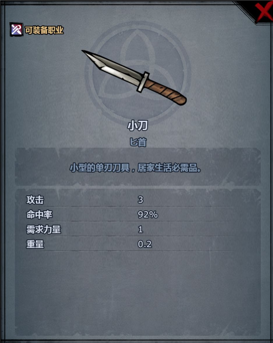 作为游戏早期的匕首武器,小刀拥有3点的不俗攻击力,92%的极高命中率,只需1点的力量需求,和0.2的超低重量,简直是完爆第一期的选手。