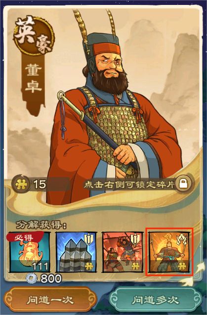 (2)主将技。关羽的主将技青龙是自带的,后期把品质升上去后,可以开启其他主将技能位。这里主要重点说一下霸体碎片的获取方式:分解董卓。董卓是需要花费500元宝购买的,购买之后就可以通过牧场围猎和拜访来获得董卓碎片了。(这500元宝还是很容易获取的,并不需要氪金)