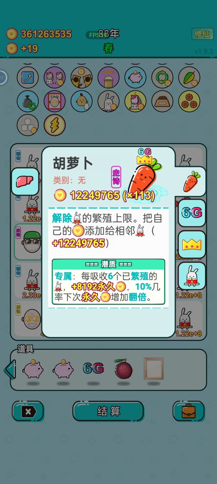 潜质胡萝卜可以吸收繁殖过的兔子,并把自己的钱加在兔子上。