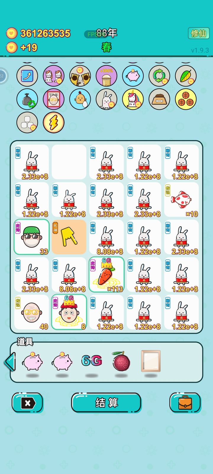 只要手指指向“胡萝卜”或者“饲养员”就是满屏幕的钱(兔子钱+胡萝卜额外钱)×饲养员×金手指