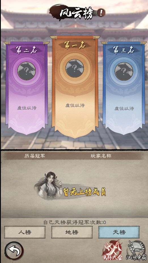 武林大会:人榜、地榜、天榜的历届冠军次数都单独计算,统计江湖争霸历届的冠军次数,角逐出名次。
