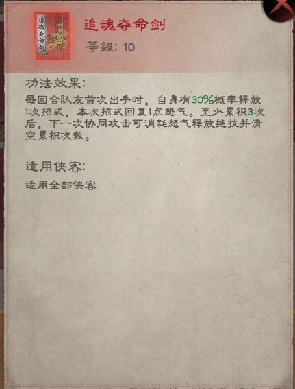 满级功法效果:每回合队友首次出手时,自身有30%概率释放1次招式