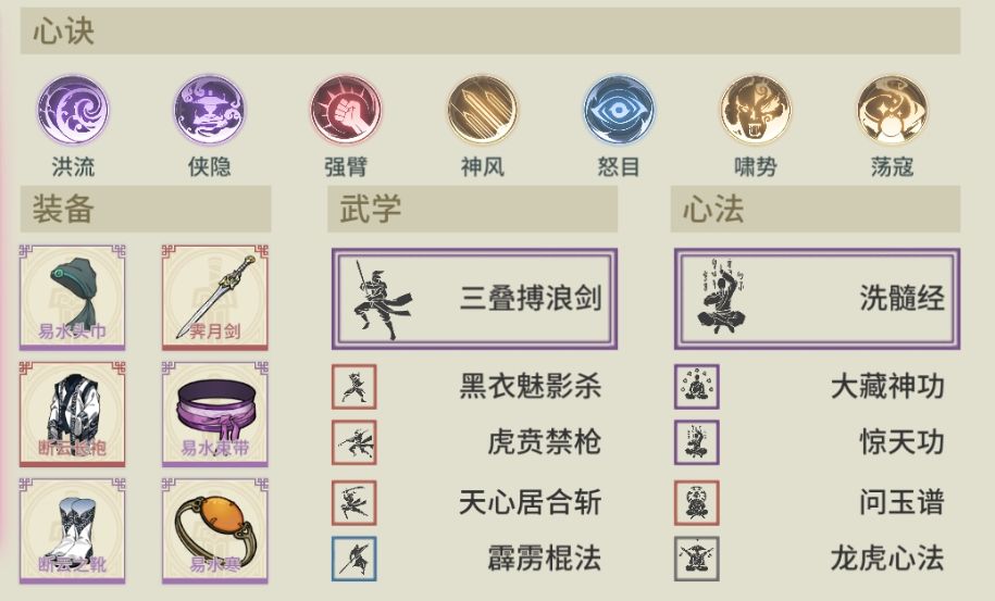 核心是侠隐+洪流,其他不要在意,因为我本是个天武!荡寇很重要,驱掉刀魔BUFF,极大影响胜率