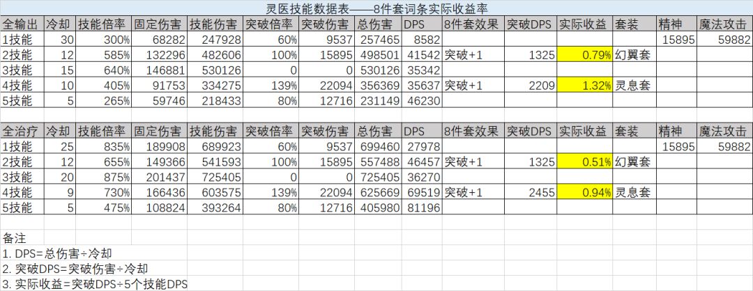 *本攻略中大部分表格数据仅对计算我目前角色生效,但对其他灵医也有一定参考性。每个人的主属性和攻击力不同(可能技能加点也不同),如需计算需要带入具体属性值。其他职业需要调整倍率后再计算。我的原始计算表理论上可以计算所有职业和角色的套装数据,只需填写你职业技能数据和角色属性。