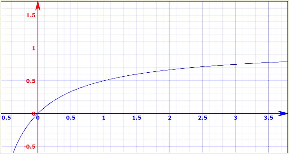 可以看出这是变量只有精神的反比例函数,我们来作图,让实际收益为y,精神为x,设a4=1,d=1,e=1,函数为y=x/(x+1),它长这样: