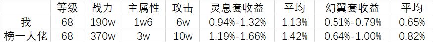 不过从变化曲线看可以大致估测,目前大部分玩家实际上的收益在0.5%-1.5%之间,主属性越高,收益越高。我给我们服战力第一人也测算了一遍,对比表格如下,