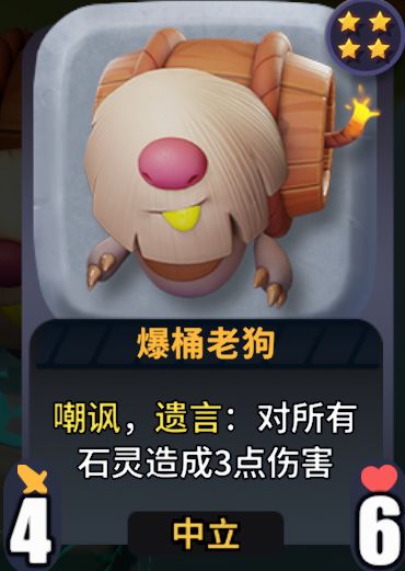 爆桶老狗:嘲讽,遗言,对所有石灵造成3点伤害。