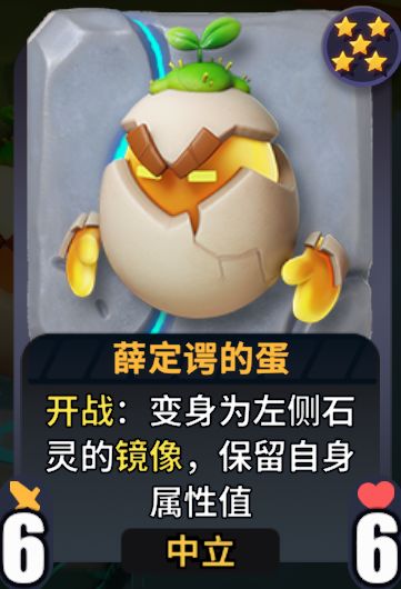 解析:这是前期有力的buff加成的石灵,能给阵容带来更多的伤害,并是嘲讽石灵,具有复生,可以保证飞刺蜂卫遗言效果以及英雄技能赋予复生的触发,同时触发双角队长的成长效果,有着很大的保护作用。