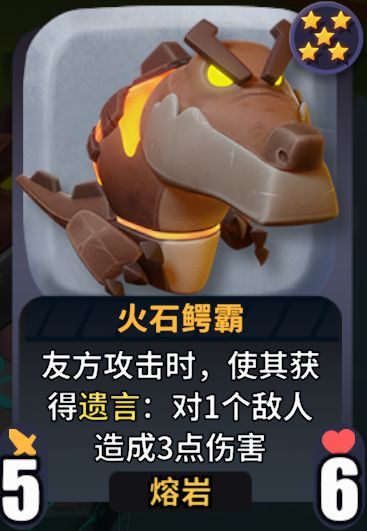 火石鳄霸:友方攻击时,使其获得遗言(对1个敌人造成3点伤害)