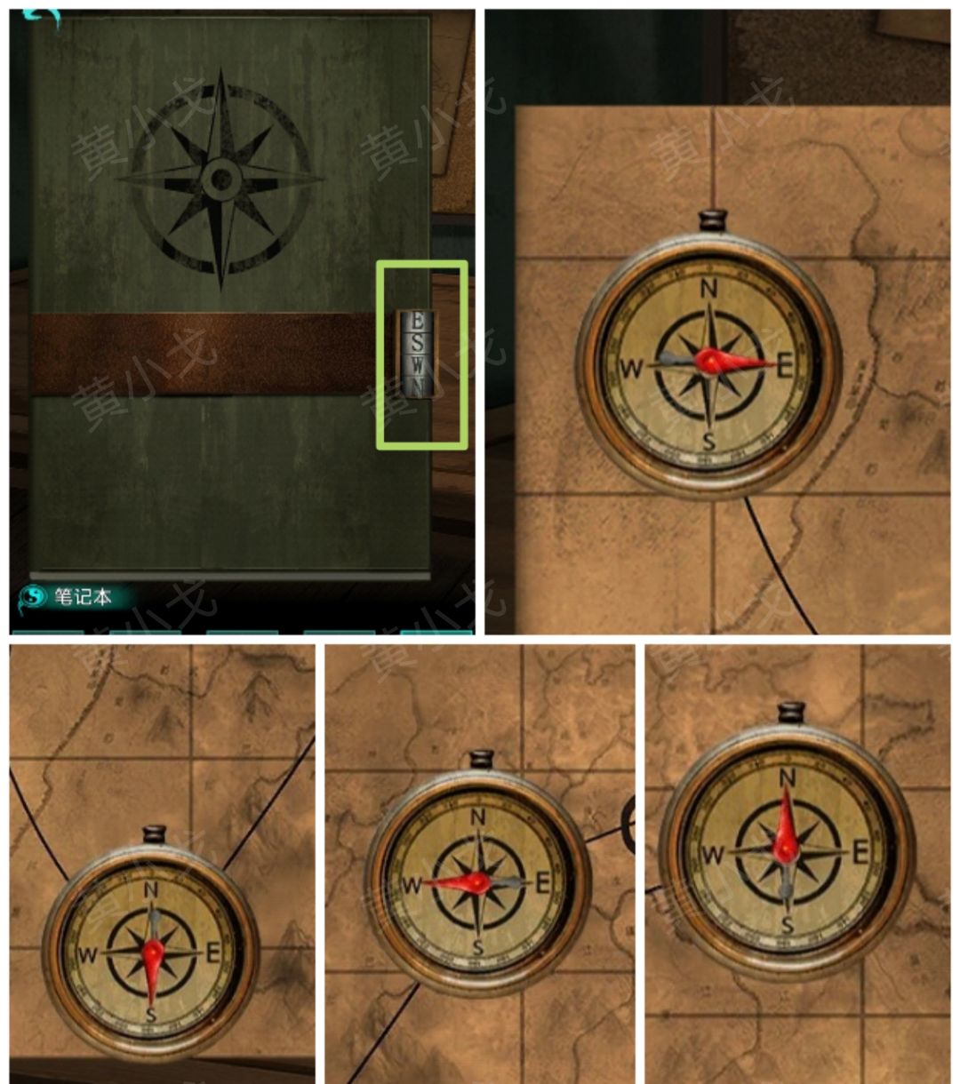 12.打开【笔记本】特写,根据笔记本封面上的提示(指南针图案),结合在地图上使用指南针后出现的线索,输入密码:ESWN