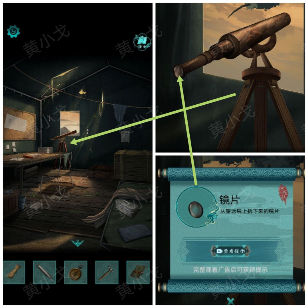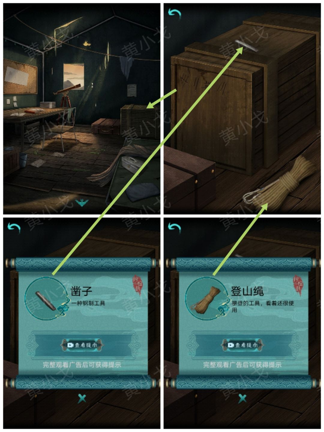 6.(帐篷内)点击木箱,获得【登山绳】和【凿子】(注意看箱子上的刻痕)