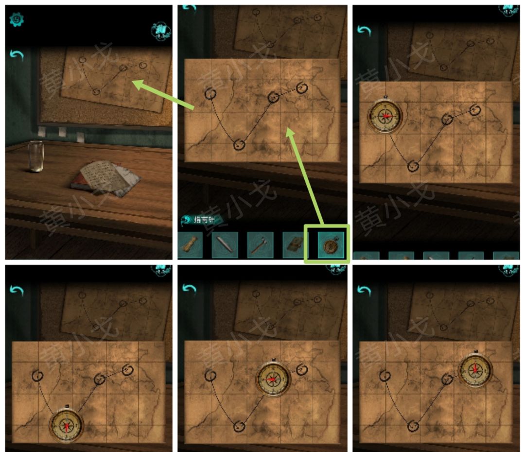 11.点击地图,对圈起来的地点按箭头顺序依次使用【指南针】,获得线索(红色指针指向:ESWN)