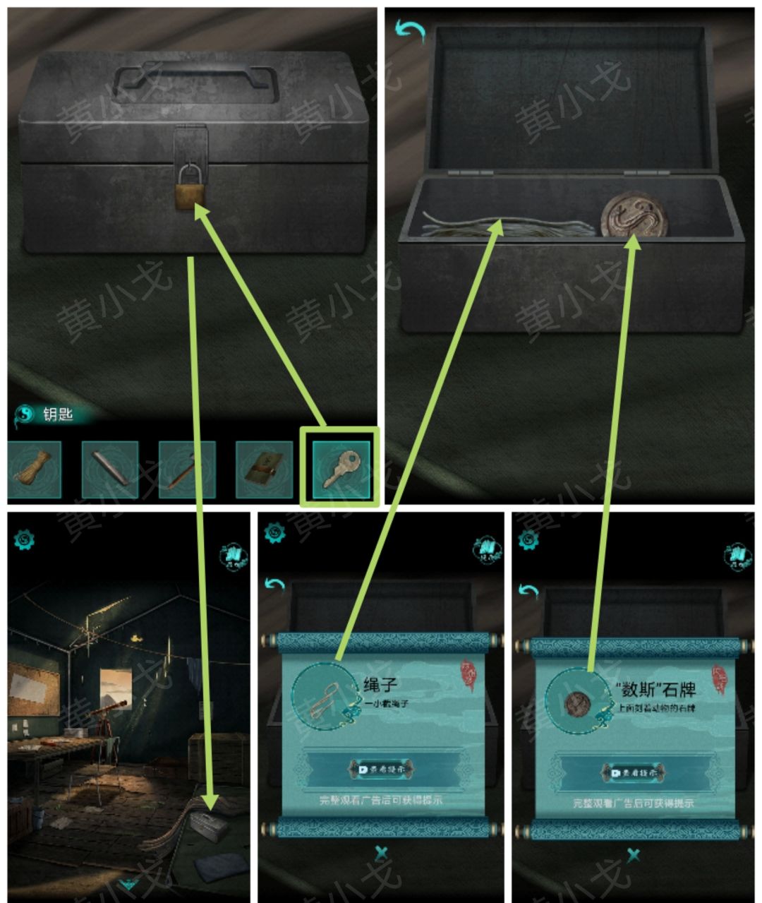 14.点击铁盒,用【钥匙】打开,获得【“数斯”石牌】和【绳子】