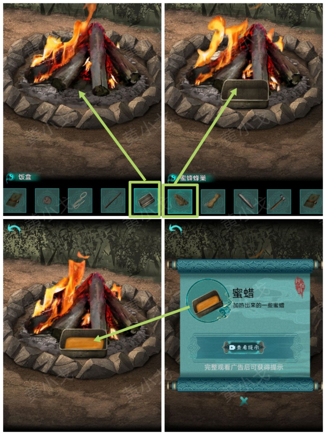 17.把【铁盒】放到火堆旁,再把【蜜蜂蜂巢】放入铁盒中熔化,获得【蜜蜡】
