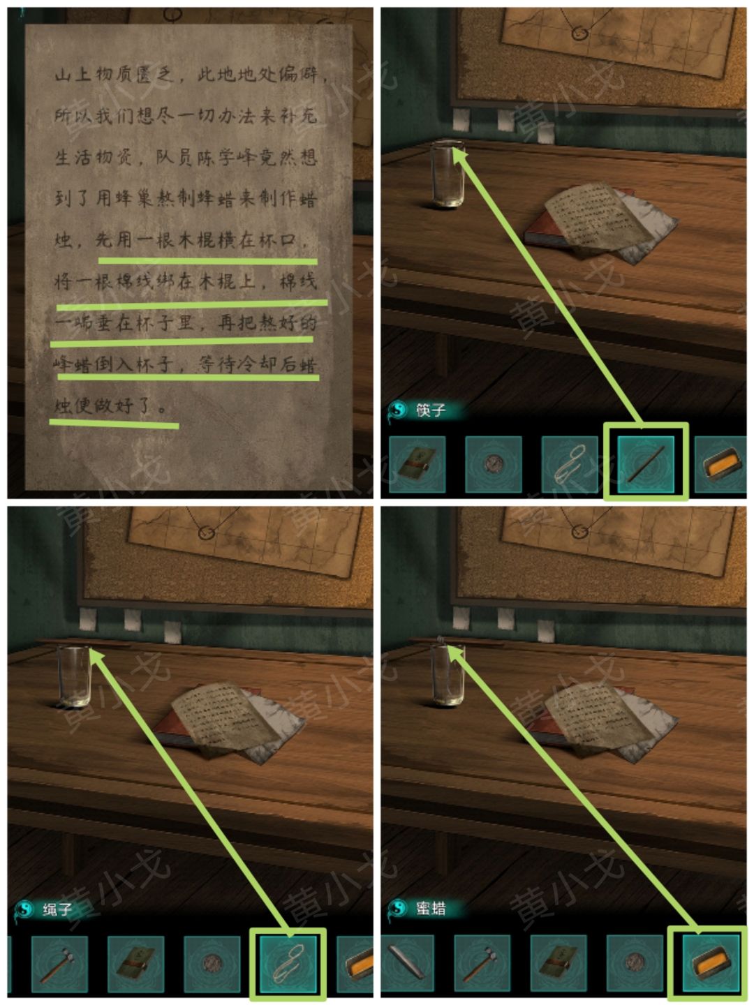 18.(帐篷内)点击桌子,根据纸条上的制作蜡烛的方法,把【筷子】放到杯口上,绑上【绳子】,再把【蜜蜡】倒入杯中