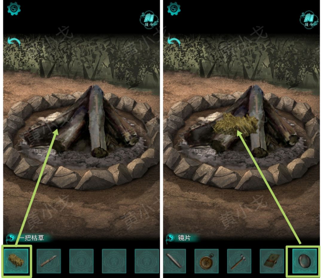 16.(帐篷外)点击火堆,放上【一把枯草】,使用【镜片】,让阳光透过镜片点燃枯草