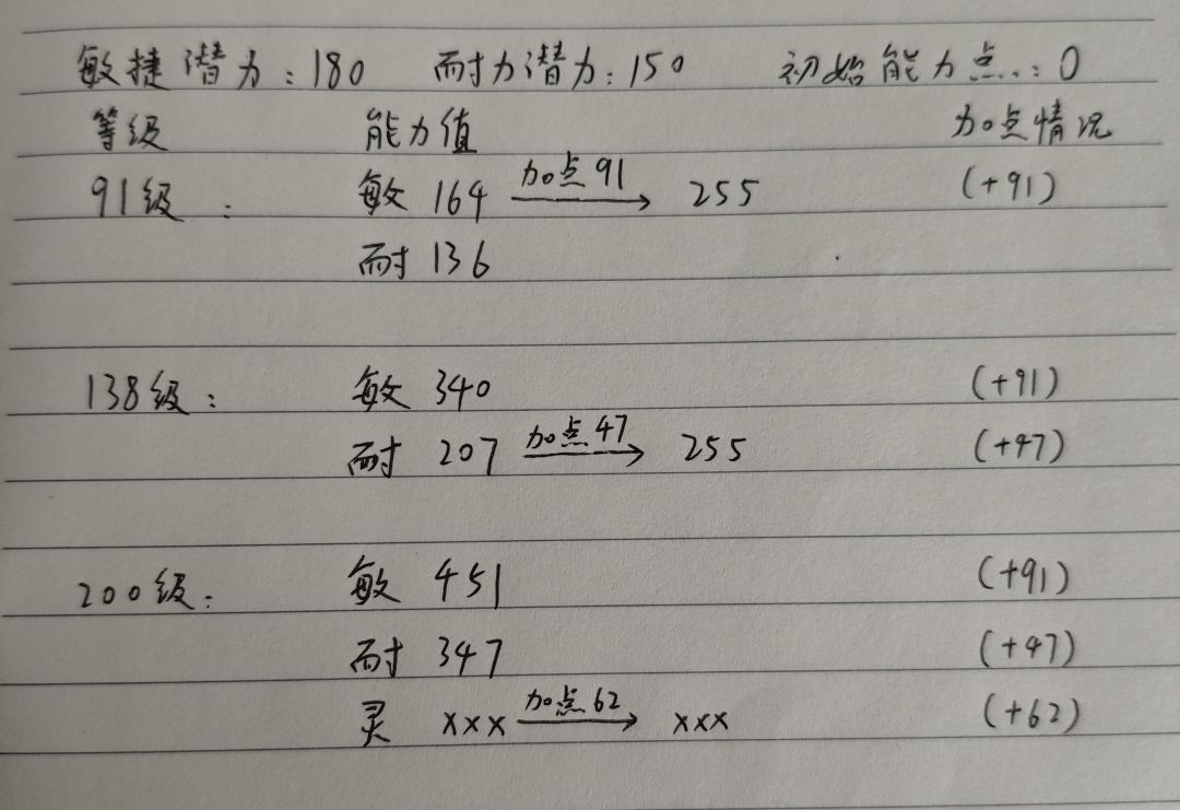 大概135级左右就边升边回去看了。同理让耐力达到255,后面加点点灵巧补咏唱。