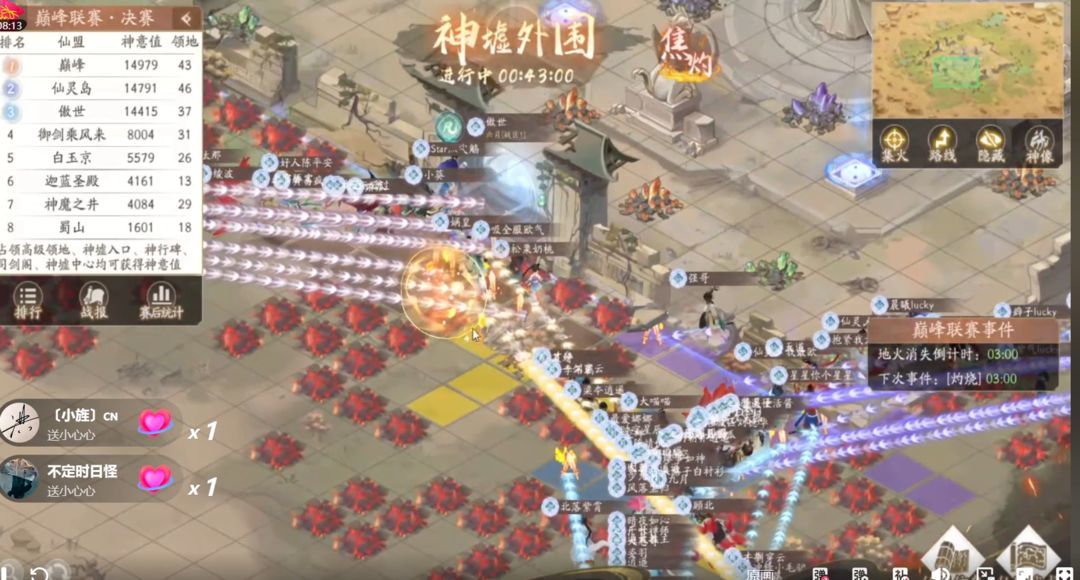 趁着【巅峰】攻打神像,内防空虚的机会,抢到风王的【迦蓝圣殿】全军突进,打了【巅峰】一个措手不及,快速拿下了【巅峰】的神行,将排名暂列第一的【巅峰】击飞出内围(截图凑合看吧......)