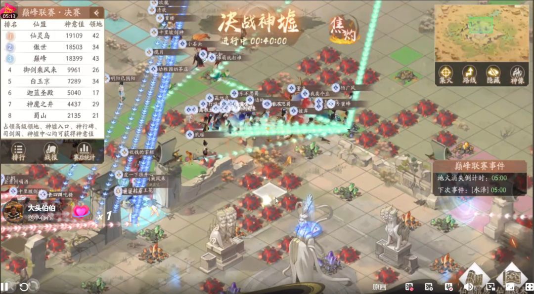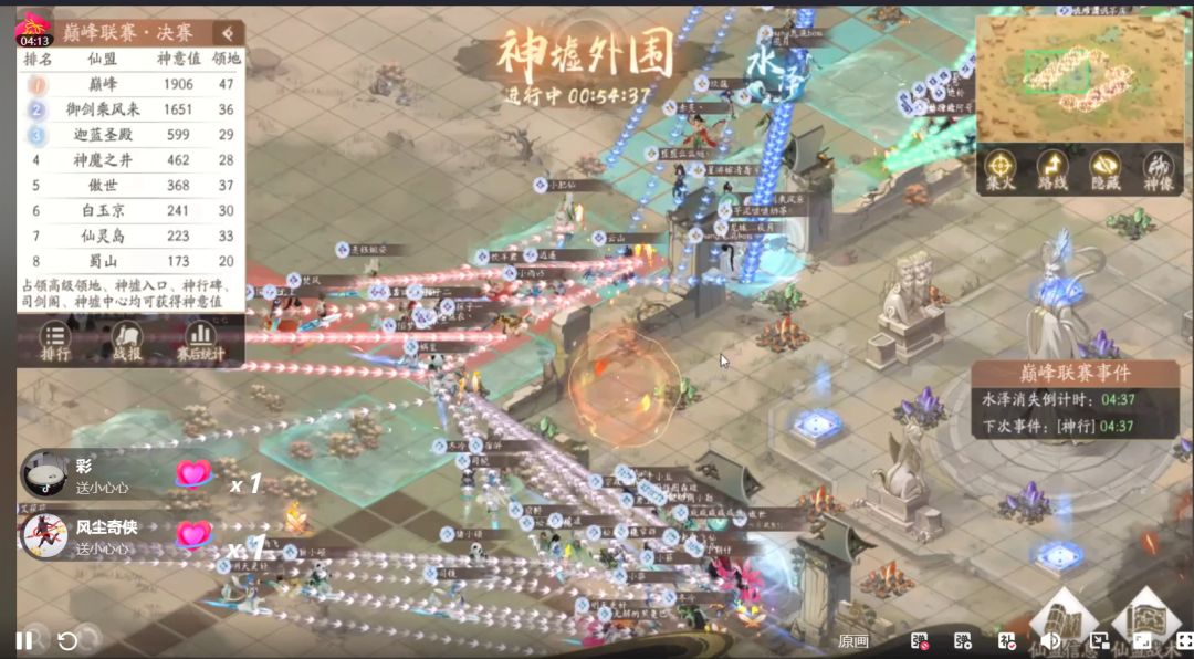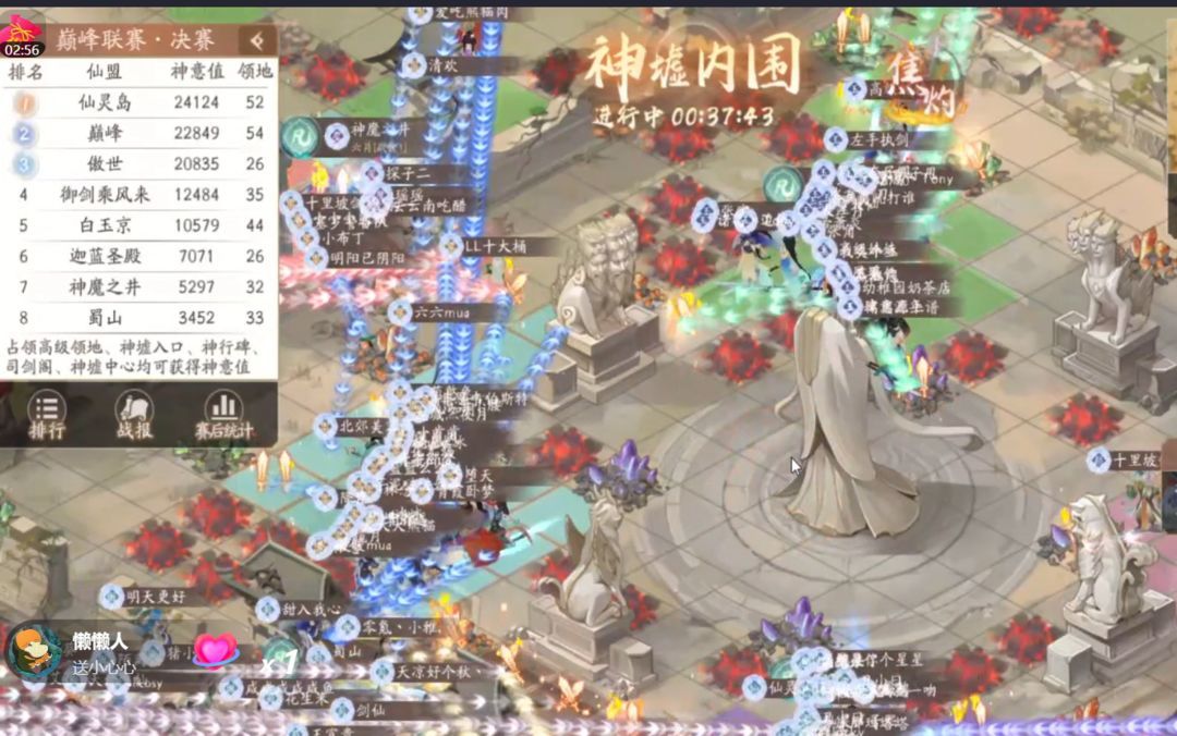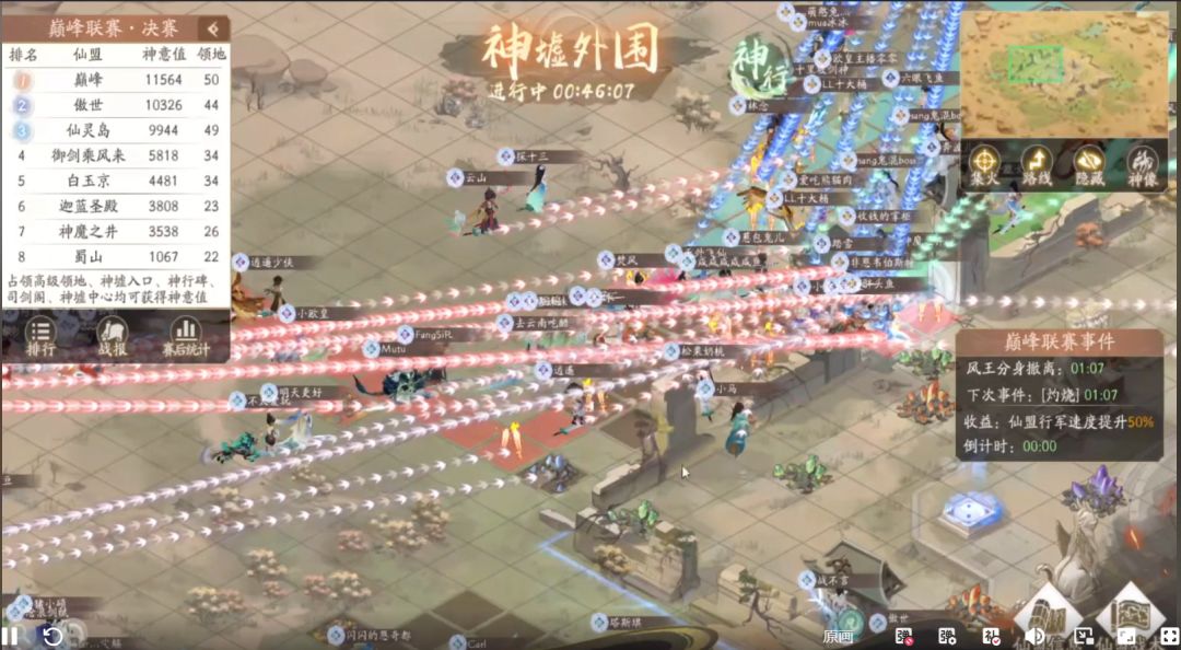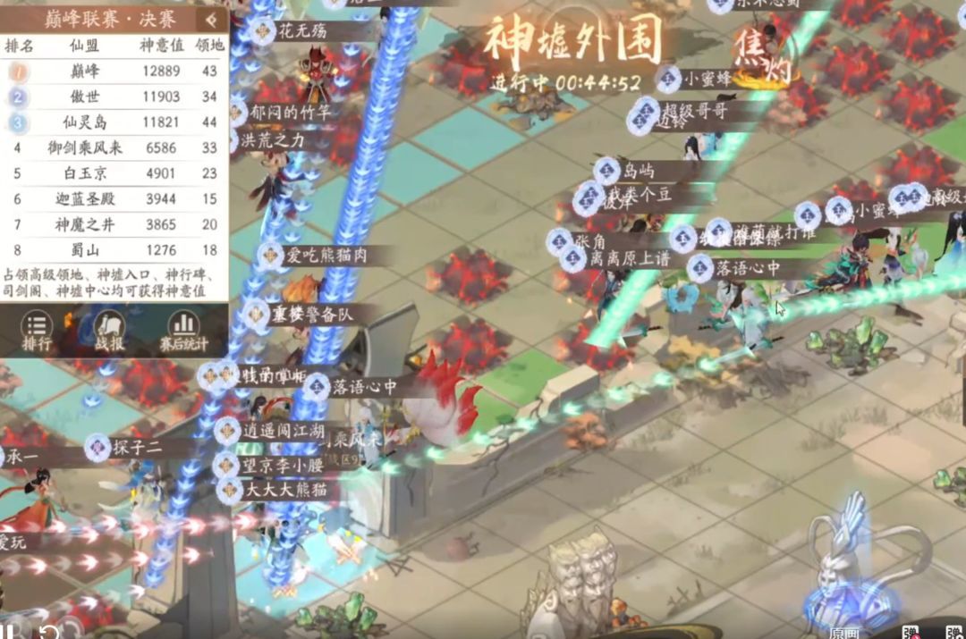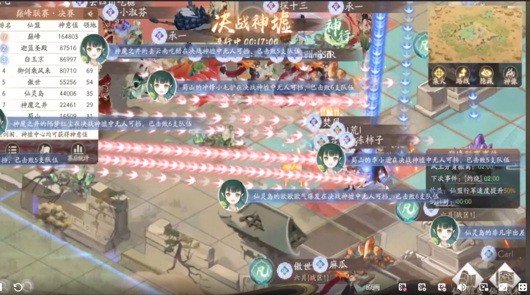 【巅峰】、【蜀山】、【白玉京】此后一直持续进攻想要突入内围,【神魔之井】也尝试变幻路线突破,但已经牢牢把内围控在手中的【御剑乘风来】同盟始终严防死守,没有给他们机会,并且最后几分钟才开始换神像控分,铁三角牢不可破