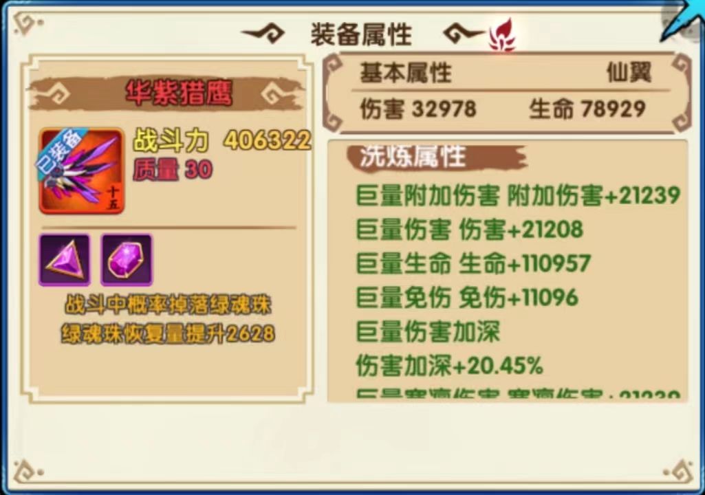 从上表可以看出同为红色30级仙翼,天罡凤影生命属性是华紫猎鹰的128倍,伤害属性是华紫猎鹰的10倍,战斗力是华紫猎鹰的3.6倍,天罡凤影属性及战斗力都远超华紫猎鹰。