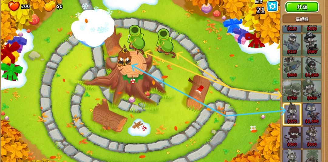 例如我在中等难度买了两个迫击炮猴子(总计1500块)和一只法师猴子(375块),那么我的回合经验在分配的时候就会根据投资的比例等比发放给每种猴子。在这个情况下我的总投资是1835块钱,迫击炮猴和法师猴分别占据总量的(4/5)和(1/5)。例如我用这个配置打完第21回合获得460经验,那么迫击炮猴会获得(4/5 x 460=368点经验),而法师猴会获得(1/5 x 460=92点经验)。![[表情_微笑]](https://img-tc.tapimg.com/market/images/0f170d4b1ecf80c267e5a44b5992a199.png)
