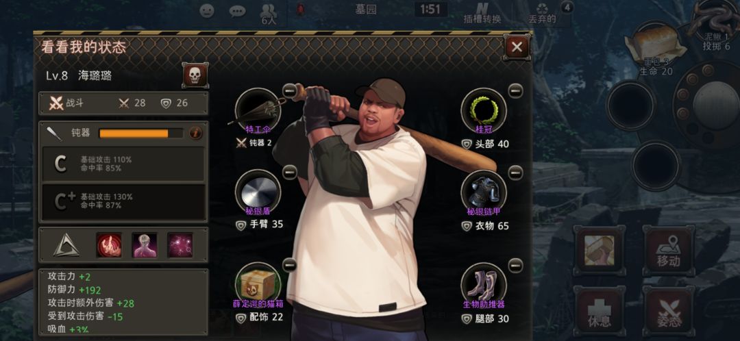 前面中规中矩按照路线走,在靶场做出三个紫装后捡到生命树枝,而因为之前被逼到市政厅一阵子所以头上带的是发箍,便有了做桂冠的想法在墓园做完桂冠后又恰好摸到了一块秘银,于是打算去池塘找点龟壳做秘银盾,顺便多捞点去做食材结果在刚做完秘银盾的时候又摸到一块秘银,正好从靶场摸到的布甲有了用途,直接做秘银甲结果在第二回合结束时我就六紫成型碾压全场可惜本身的药物没做多少,在连续跑了五个地方被六个人砍了七刀,死不瞑目的咽气了(ps:运气守恒定律)