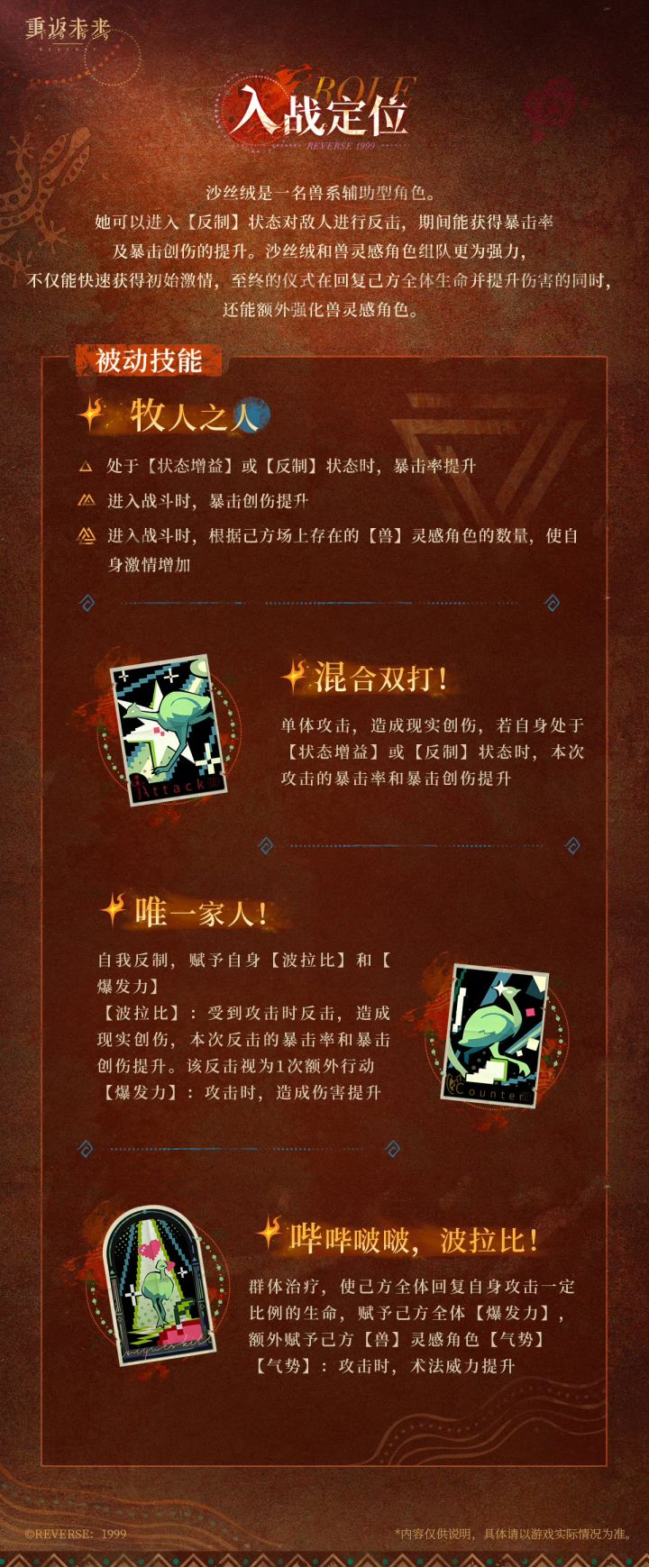 主要看点还是单体反制+全队增伤+兽系额外术法,一个吃行动次数的副c角色。