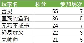 各位玩家好,非常感谢大家的参与和支持。恭喜以下玩家获得本次比赛的奖品,他们的积分分别为【言灵】55分、【直爽的鱼狗】36分、【无巧不成书】24分、【轻易放火】22分和【朱帅帅】21分。