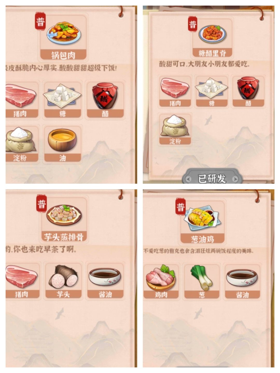 菜谱3:锅包肉,糖醋里脊,芋头蒸排骨,葱油鸡