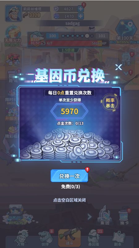 玩家每天可通过消耗核晶兑换海量基因币资源