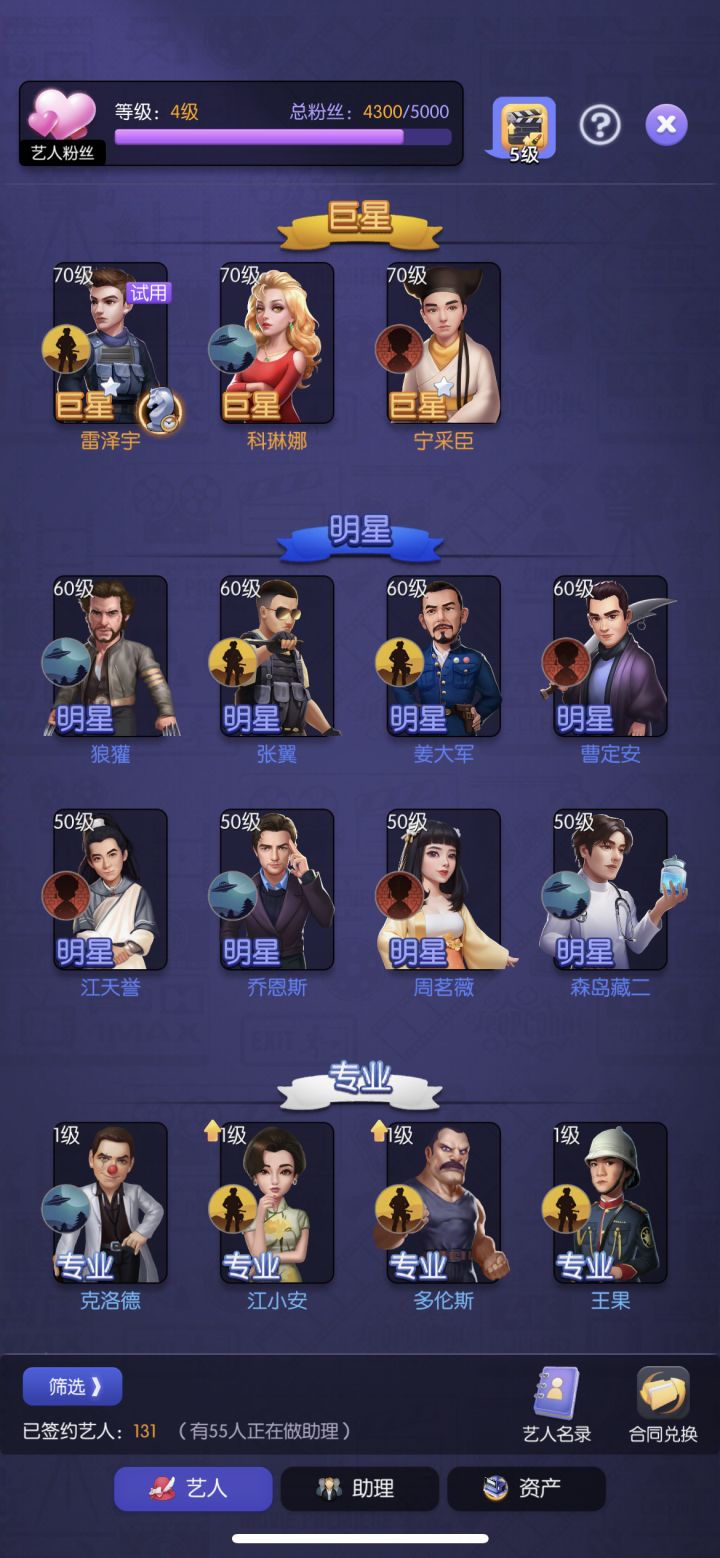 3:钻石卡星探每天可以选一个阵容心愿巨星,优先战争(雷泽宇)-其次科幻(科琳娜)-最后古装(宁采臣),按自己开局来选什么开局明星就选什么,全部三个巨星抽到后一赛季小冲玩家建议每天心愿战争抽雷升技能,冲8档容易很多,配合明星也好用,其次抽科,不建议抽宁。抽到别的系巨星直接当助理使用。每个赛季只培养当季助理明星每天拿奖励(街道,区域,城市,赛季等等)。