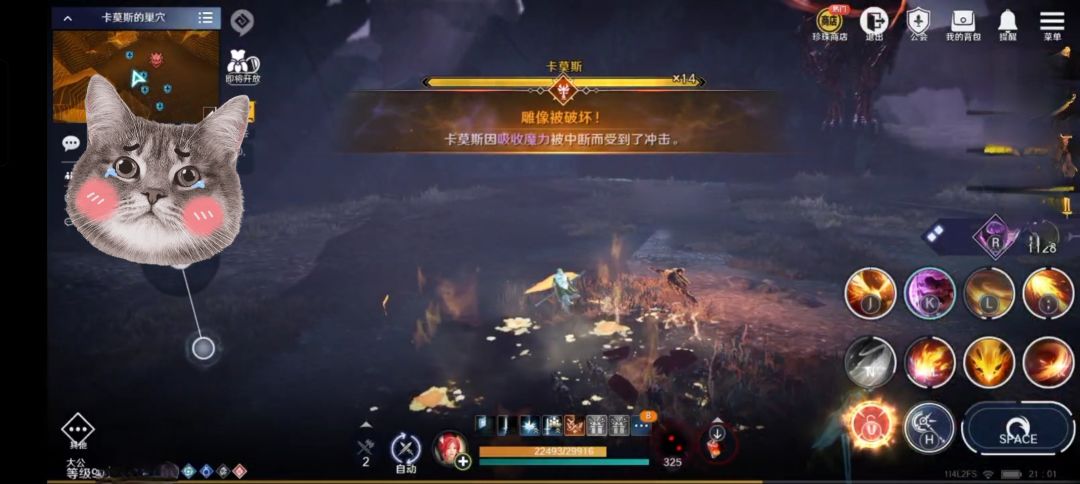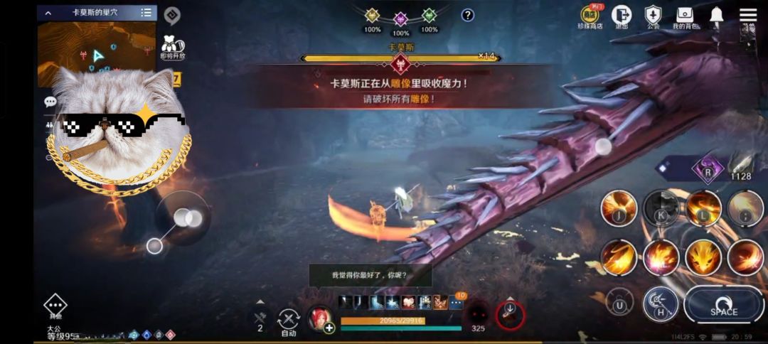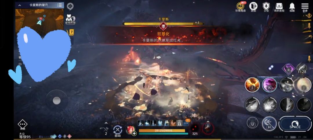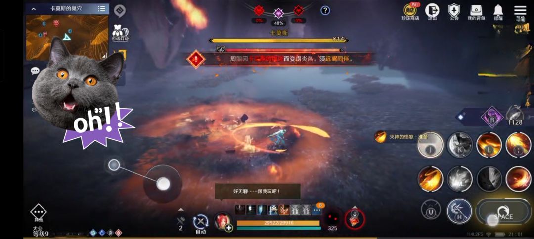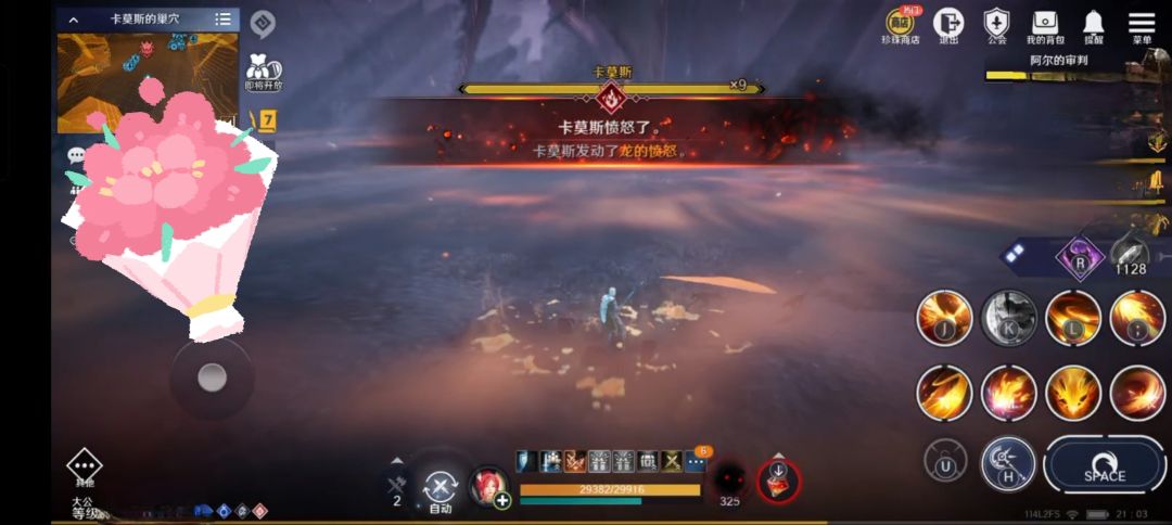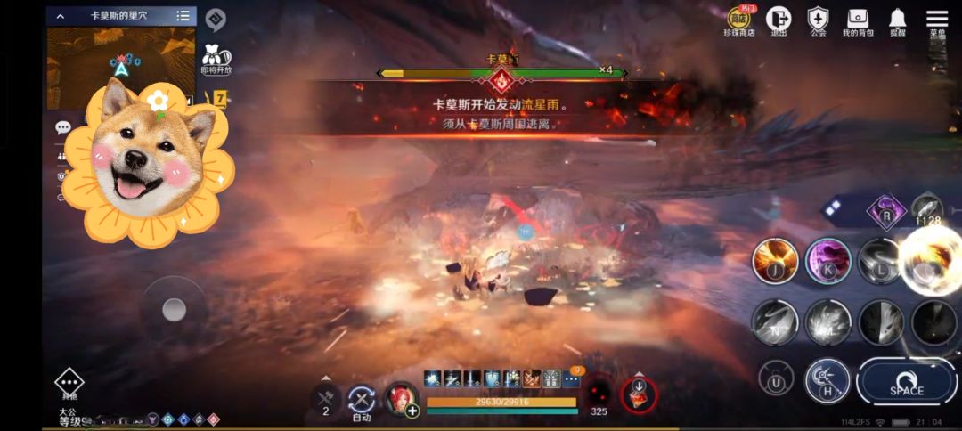 一、 卡莫斯总共20条血,即将18条血时,会飞天释放一次火流星,离远规避即可;也会飞天后,向正前方喷出火焰,需要观察红龙朝向进行躲避(两个技能随机释放其中一个);