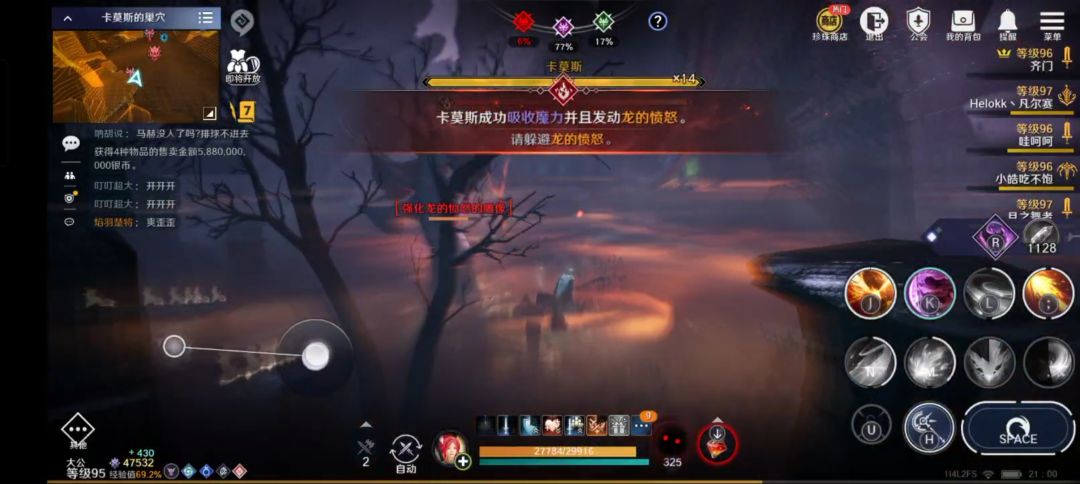 七、 红龙4条血时,会提示卡莫斯双眼发出红光。此时红龙处于狂暴状态,连续释放大范围火流星,及时跑远比较安全,或者在红龙脚下连续使用无敌技能、闪避;