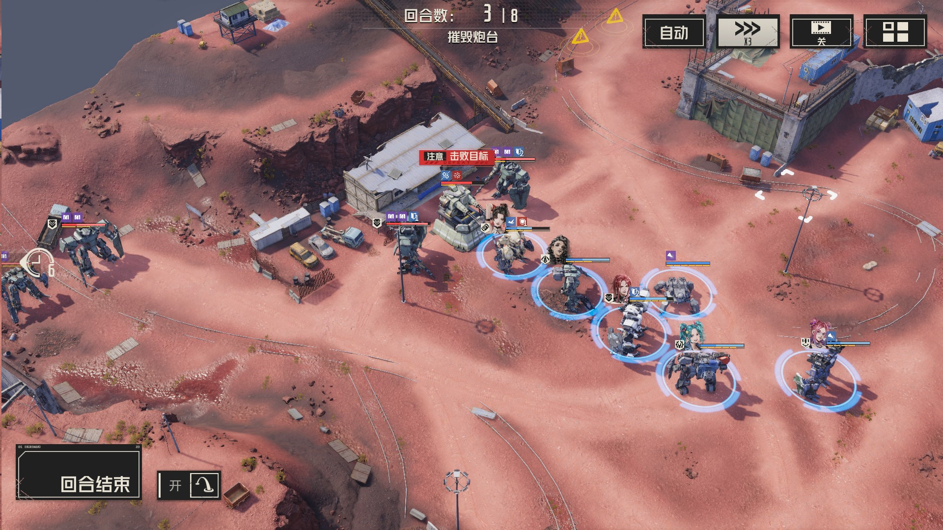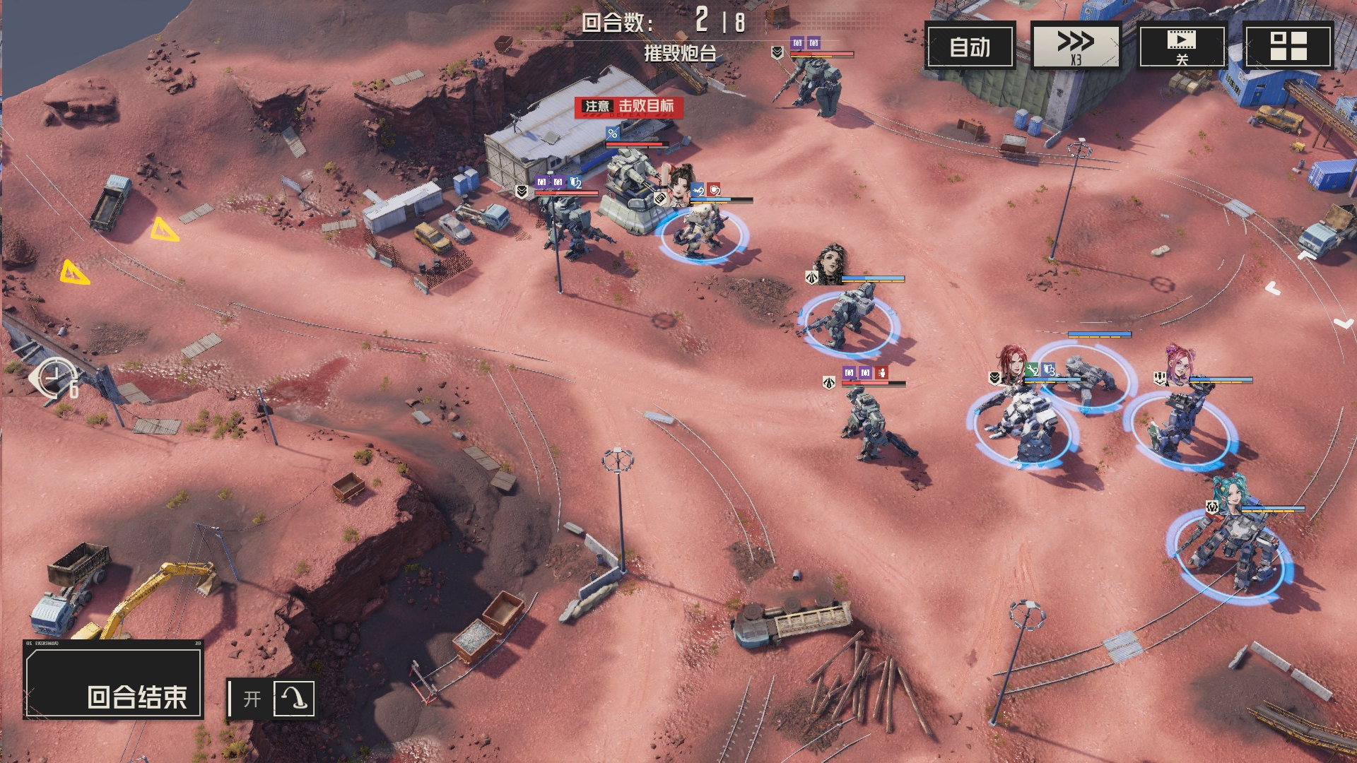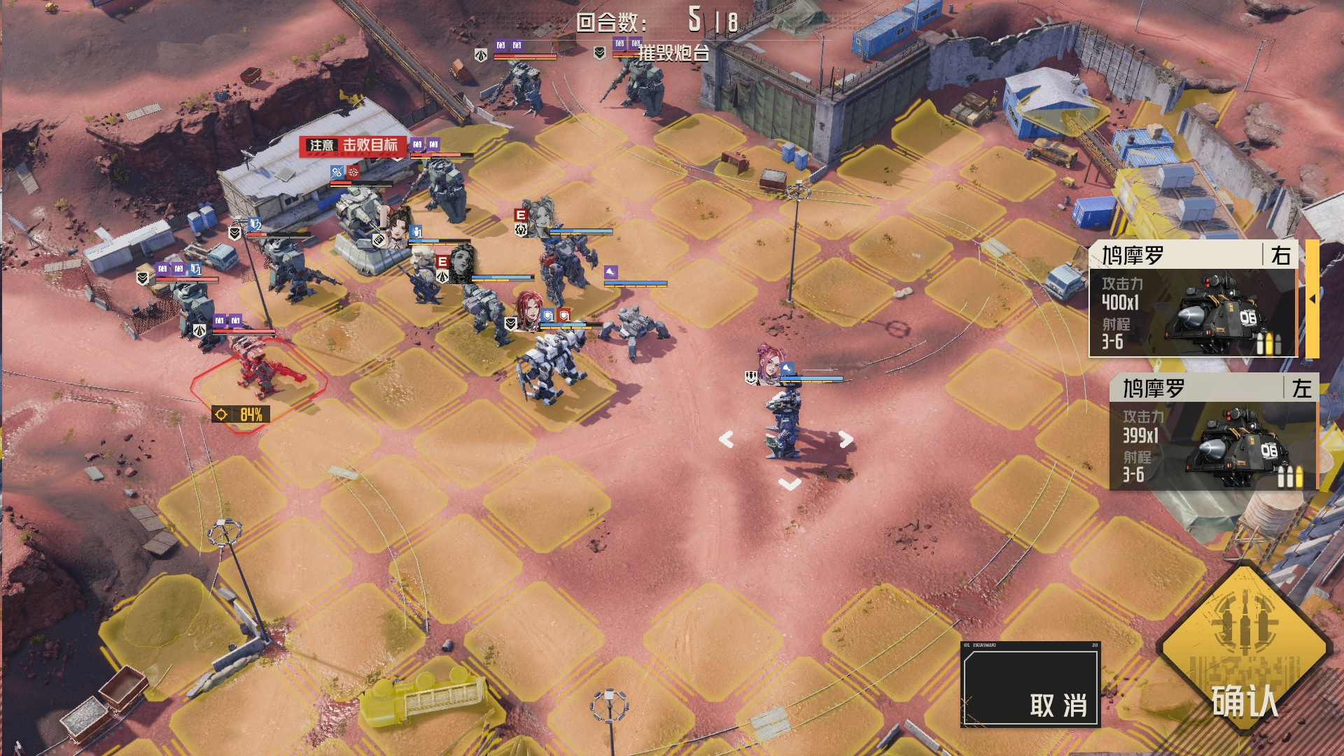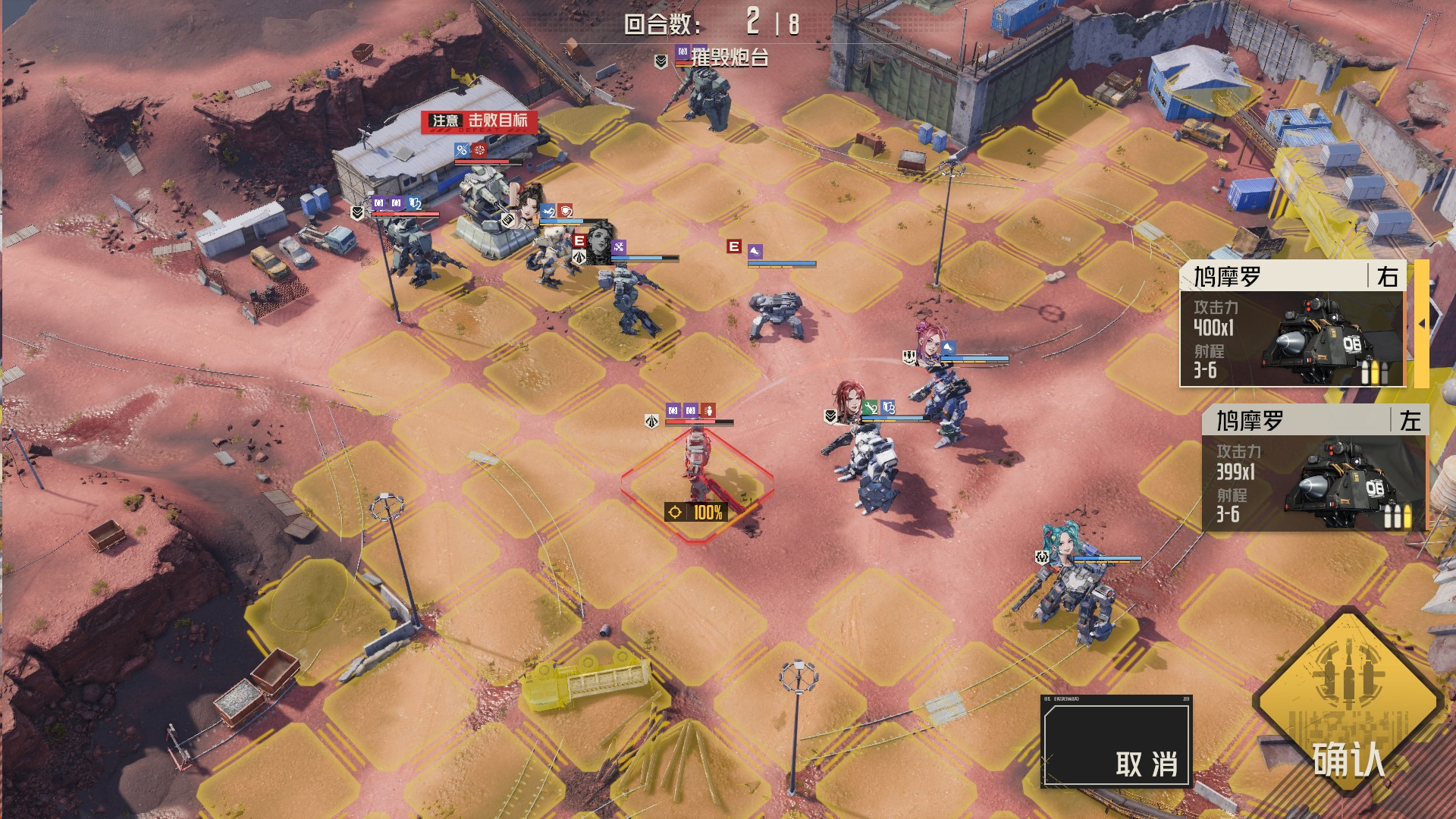 本关解法:本关较为特殊,通关目标是消灭敌方炮台,炮台血量较高,周围又有大盾兵,因此,为了在规定回合内消灭炮台,我方攻击目标应以炮台为主,而对于其他敌人,应该让奈奥米导弹先压低血线之后,再考虑让虹去升龙补刀同时再动回来攻击炮台,避免输出浪费。这种打法需要守护者吸收伤害,提高容错率;芙烈达无视援护的天赋在此关非常有效,我方攻击目标主要为炮台,所以需要守护者来吸收其他敌人伤害