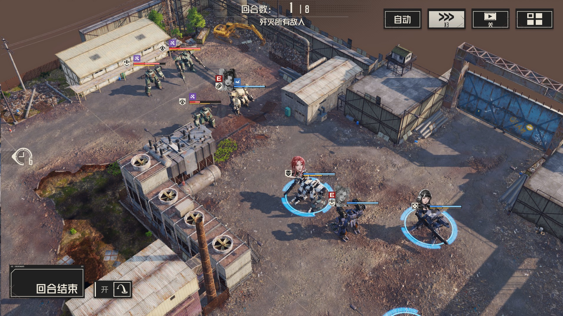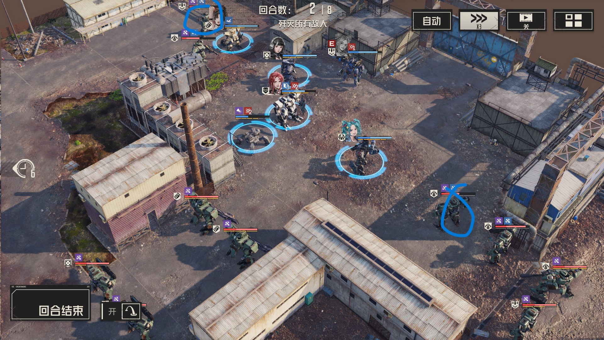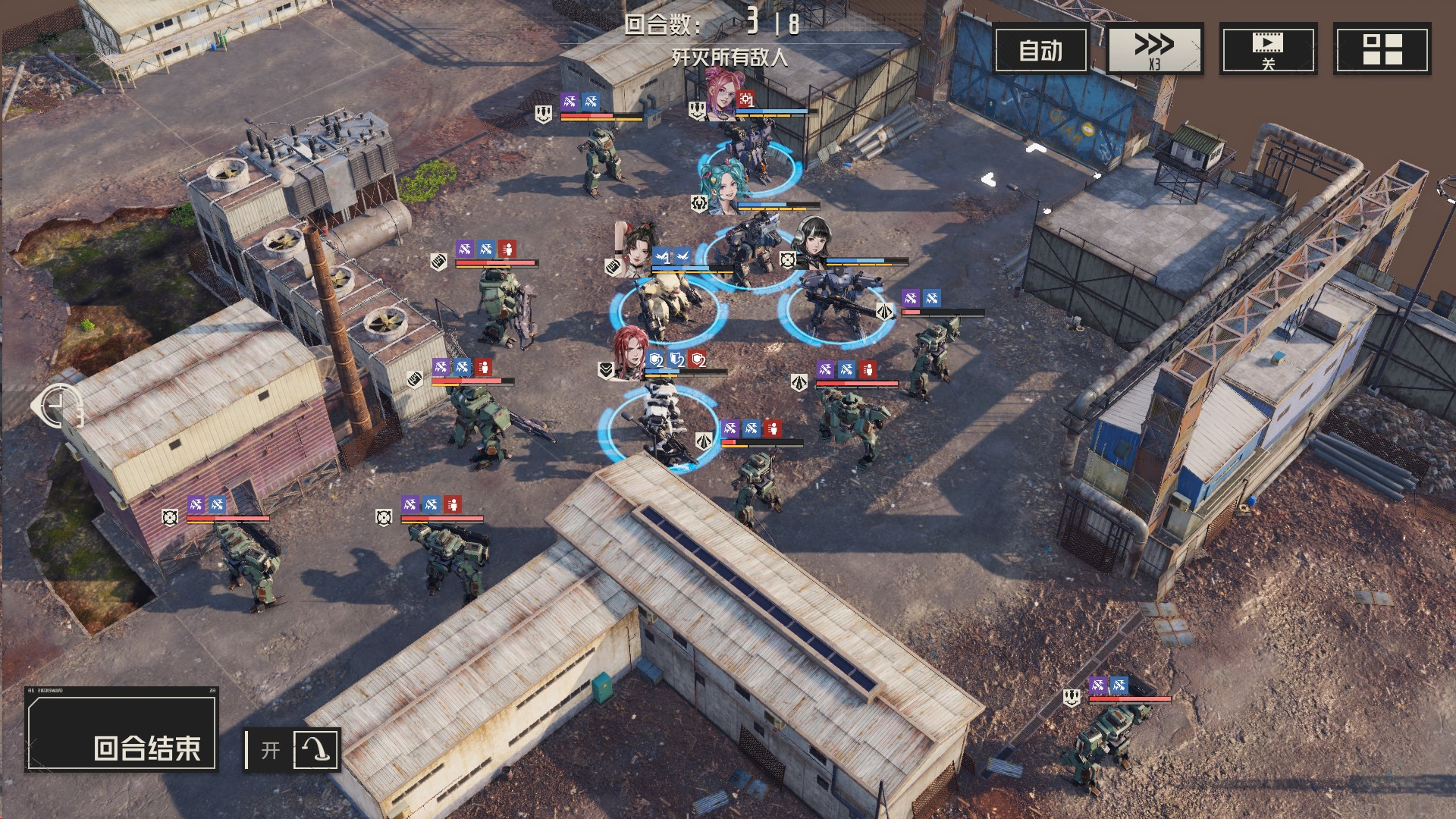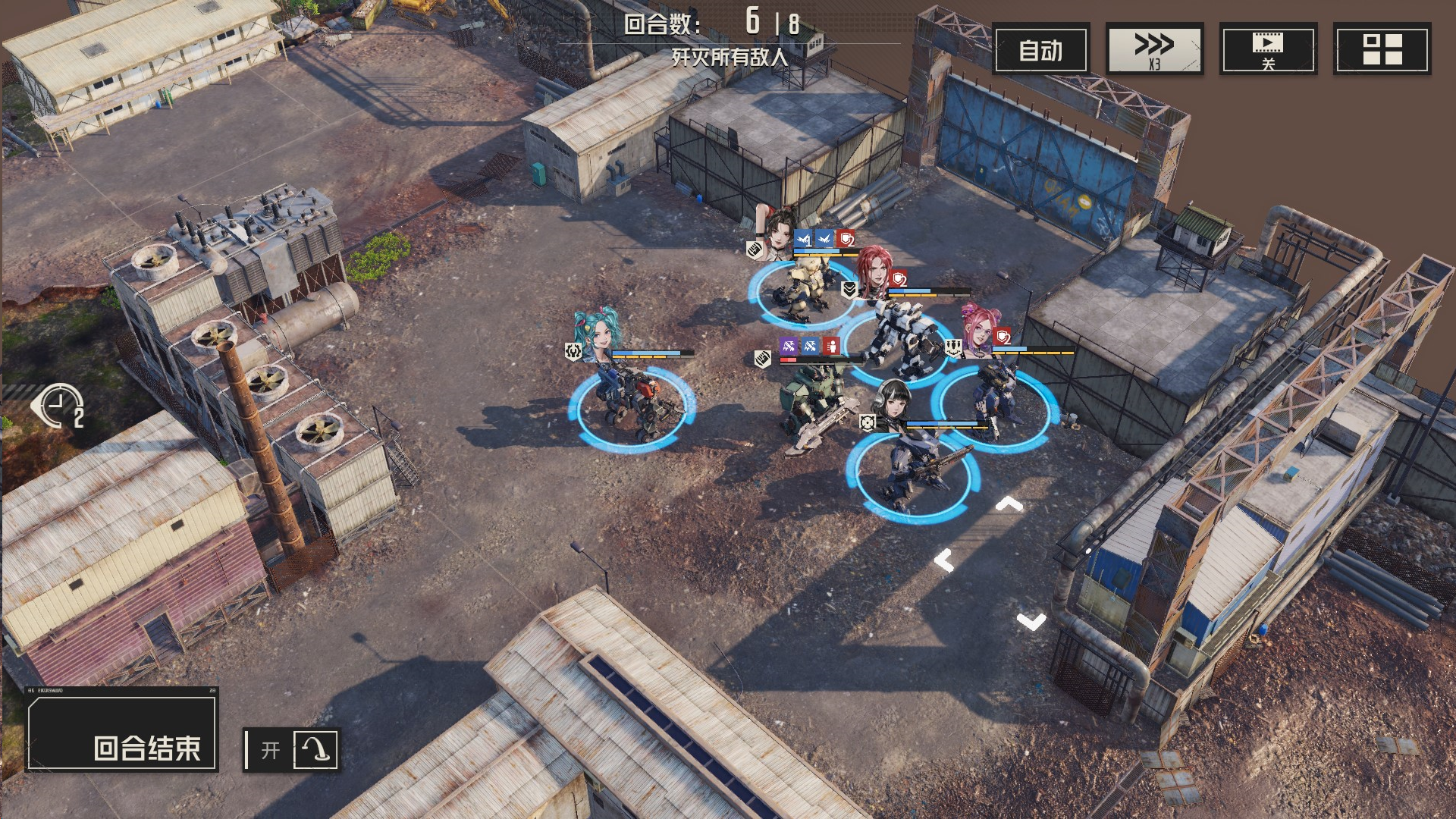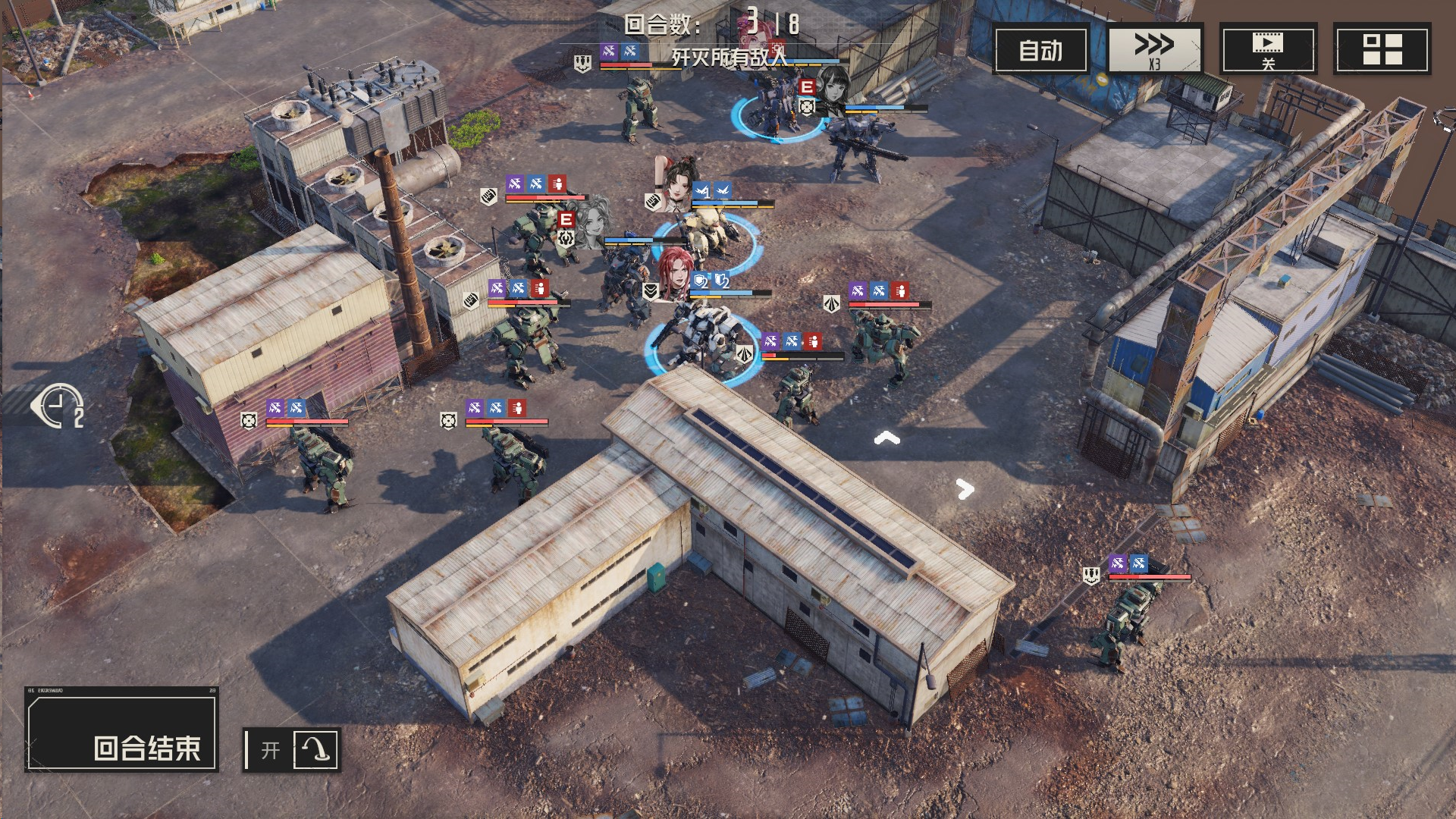 先处理左边敌人,奈奥米先手压低左前两个敌人血线,虹将其消灭并攻击导弹兵,黛娜再上方爆机枪兵躯干
