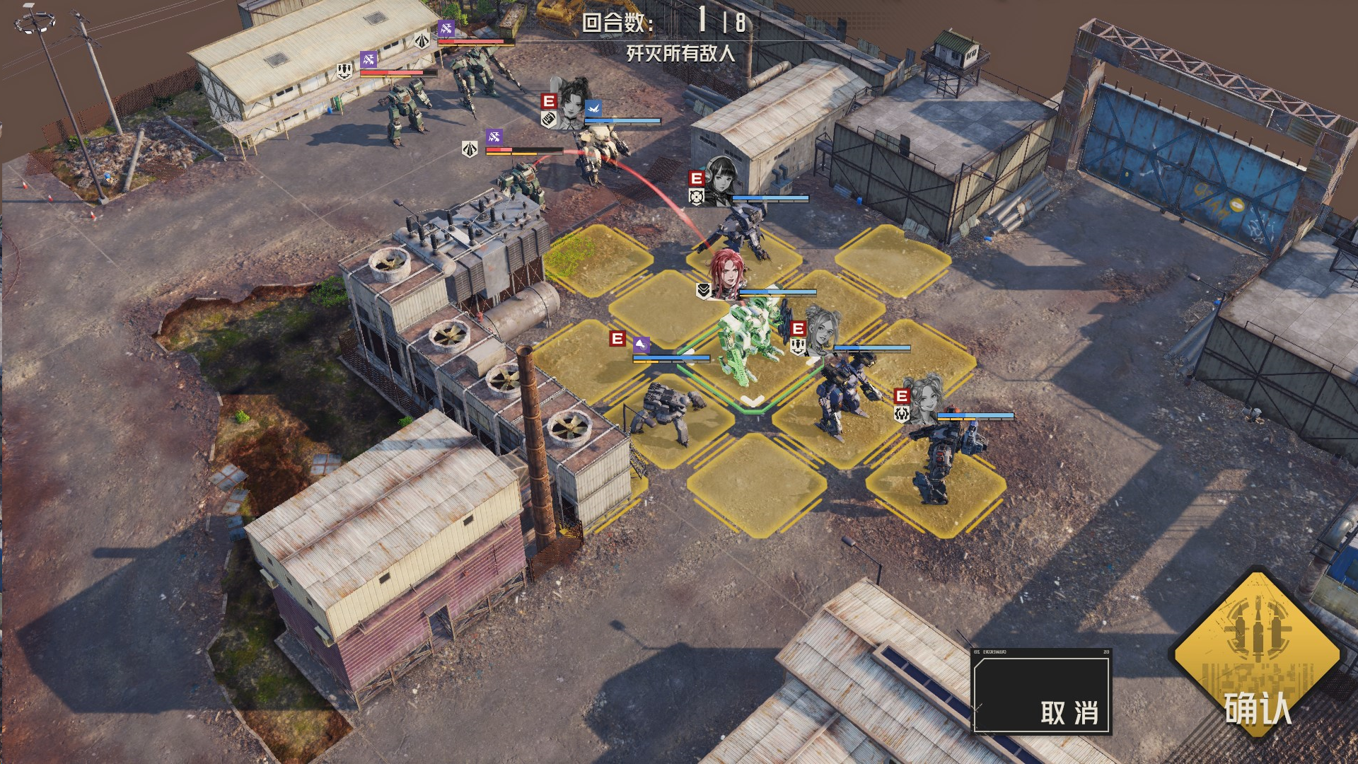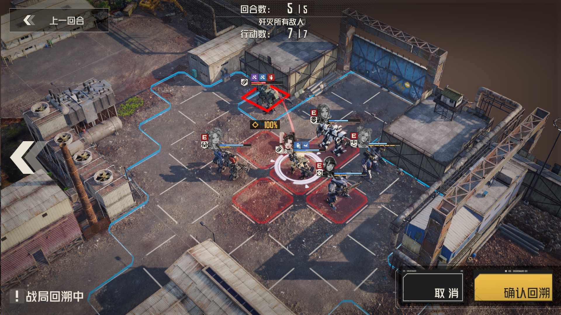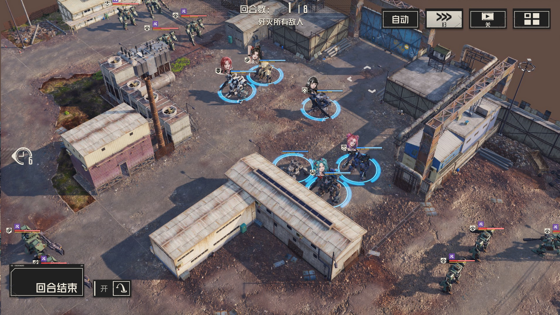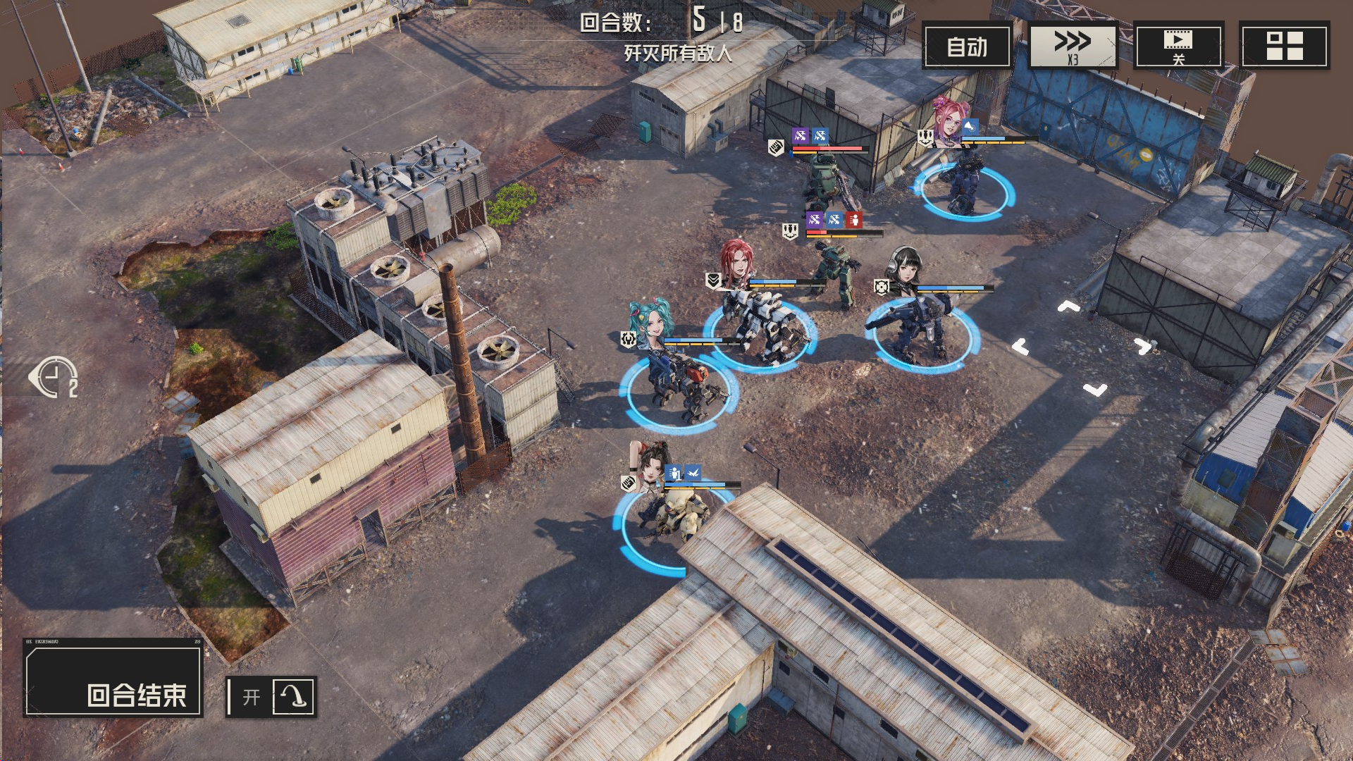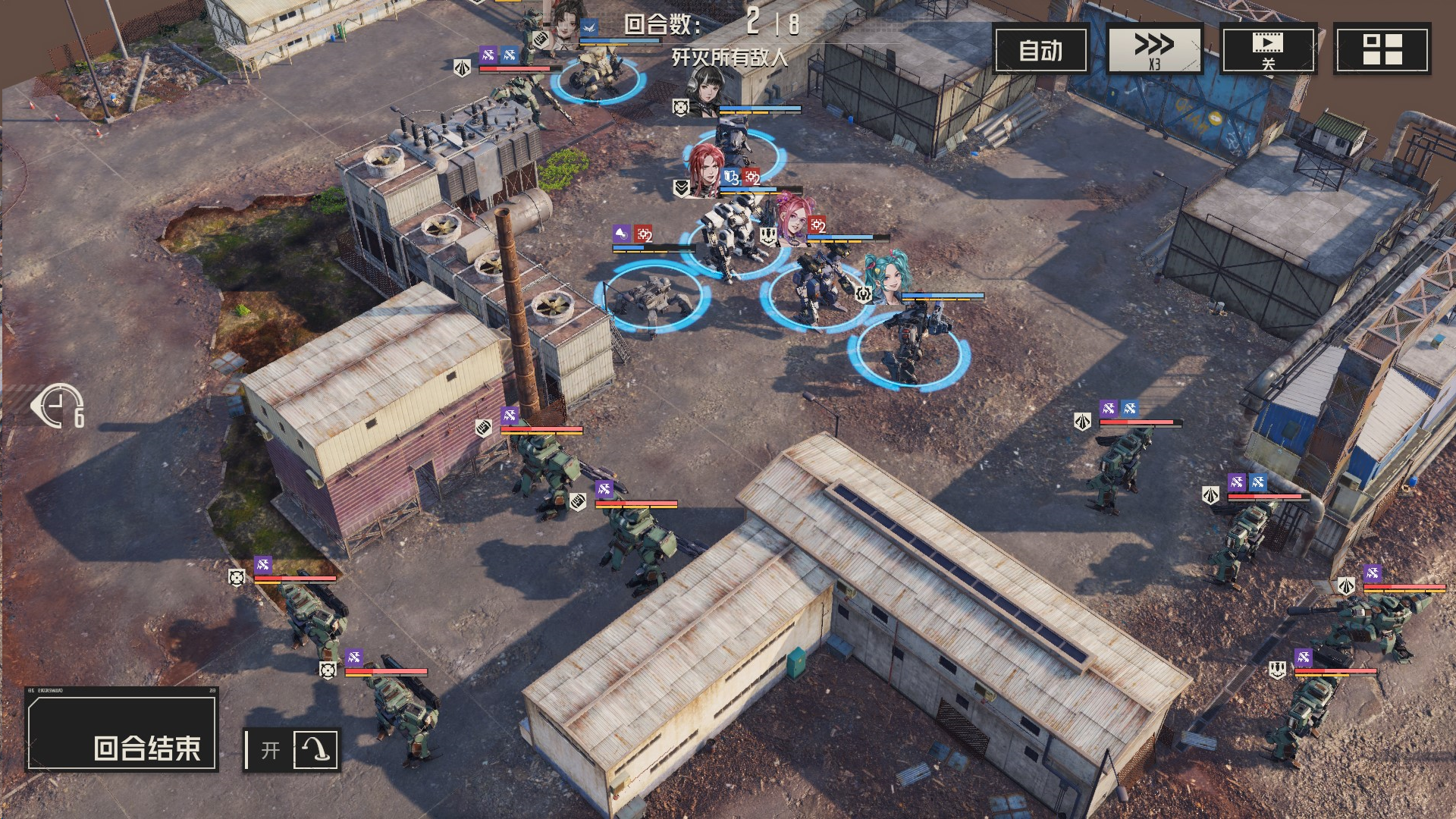 先处理左边敌人,奈奥米先手压低左前两个敌人血线,虹将其消灭并攻击导弹兵,黛娜再上方爆机枪兵躯干