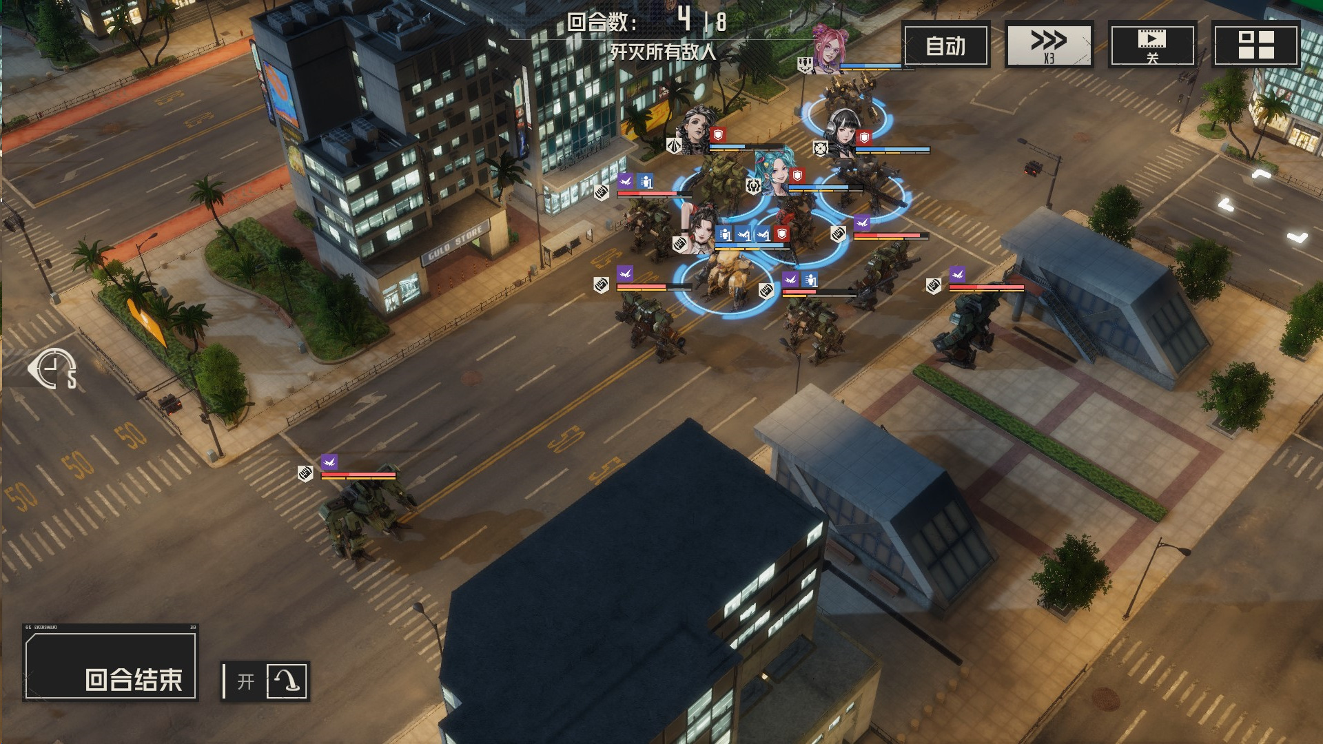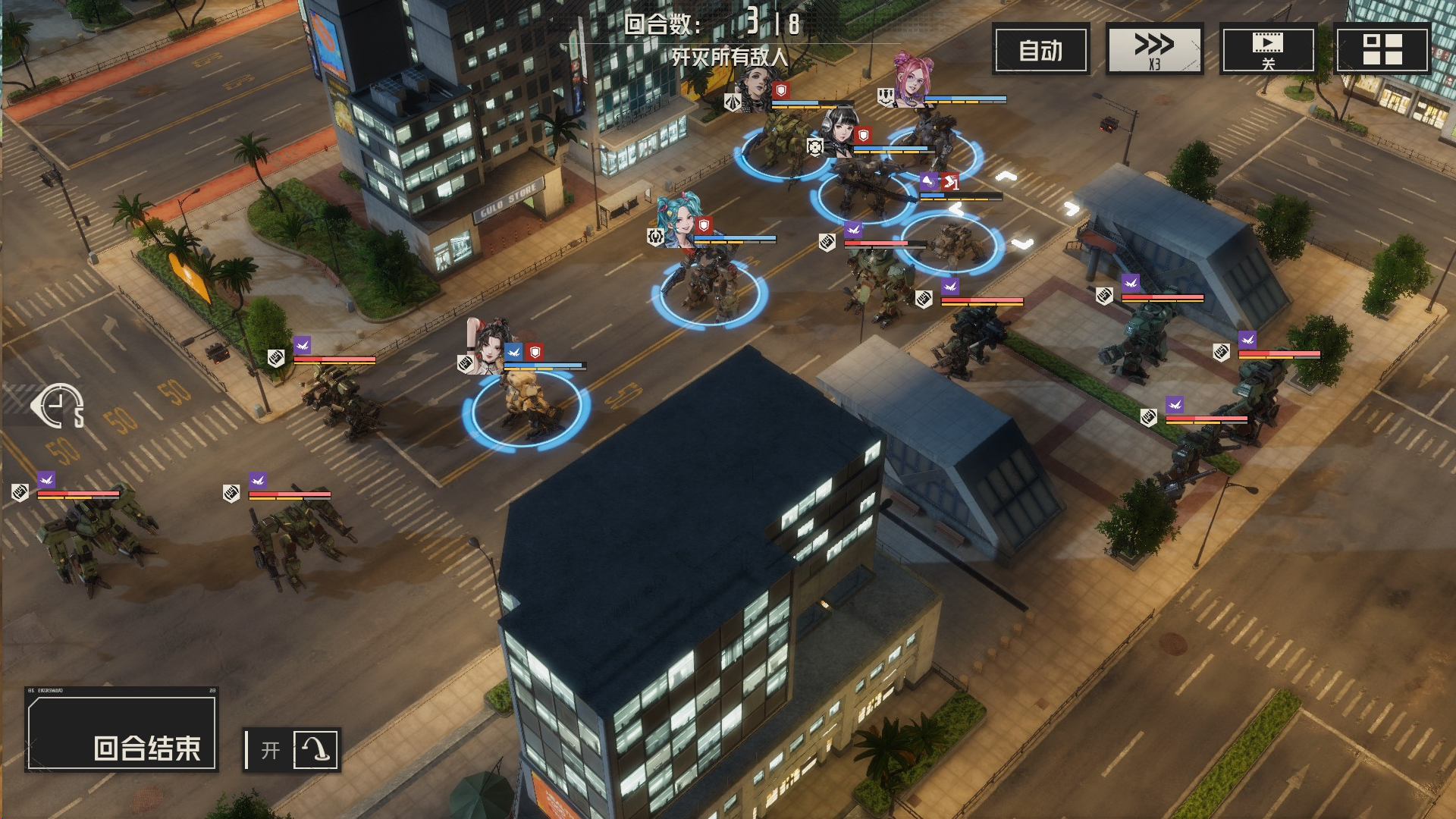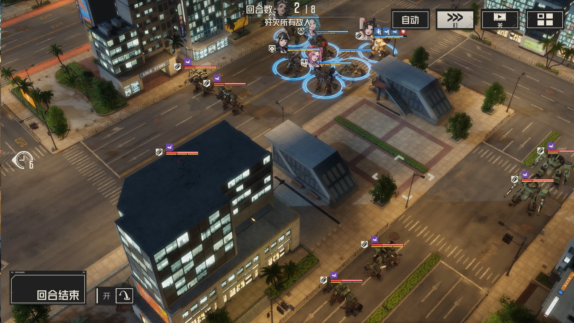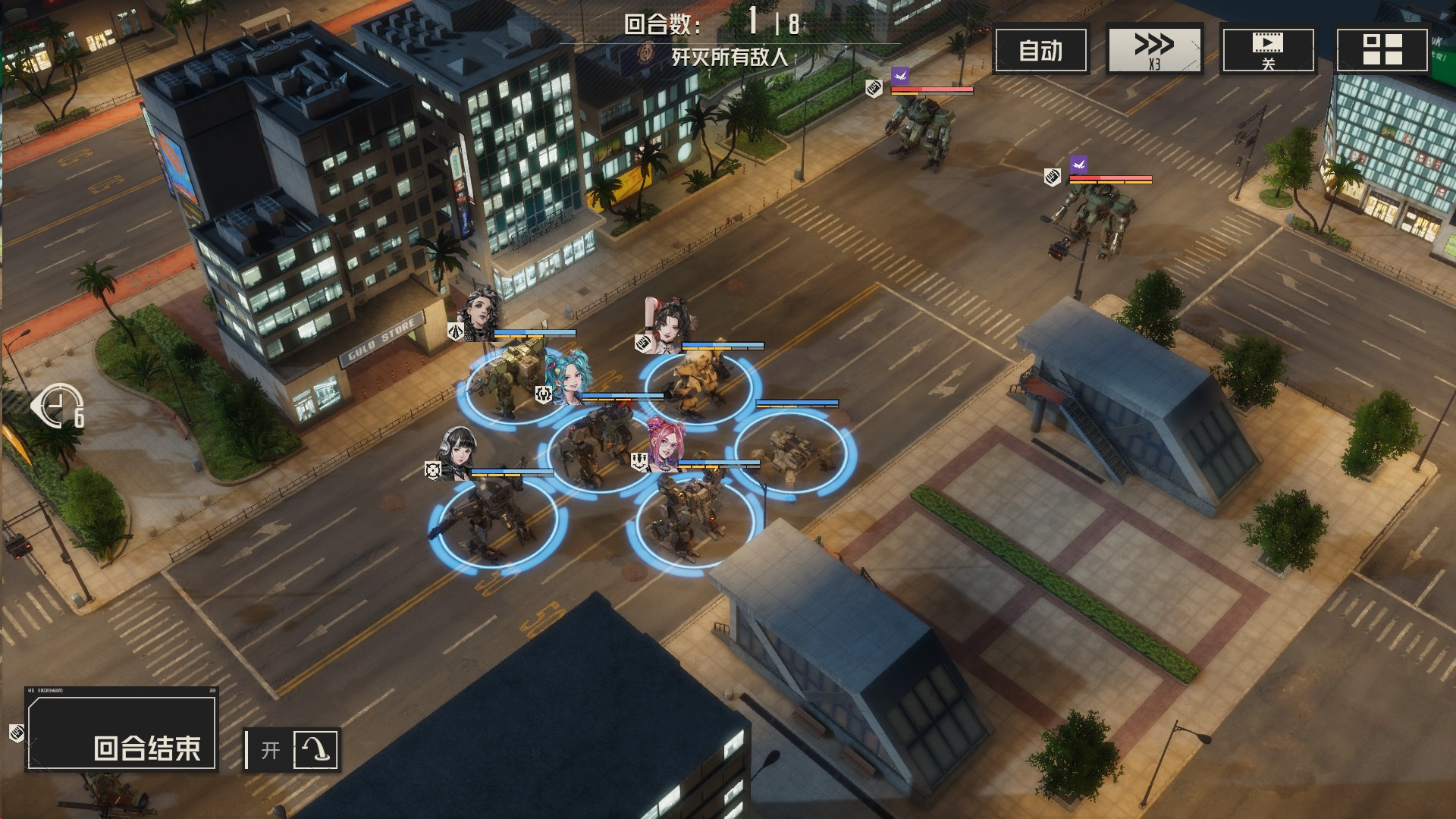 攻击左边敌人,导弹先手,然后其余远程攻击,虹收割,机械师留在最后给虹治疗,消灭敌人的时候,我方尽量不处于周围1圈