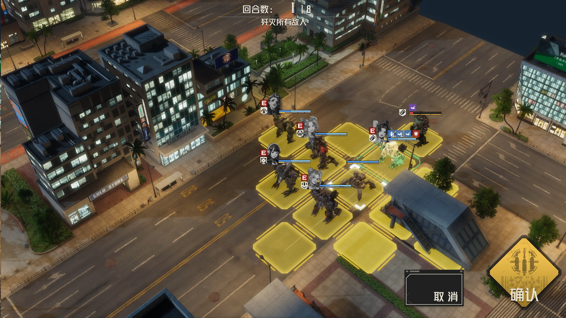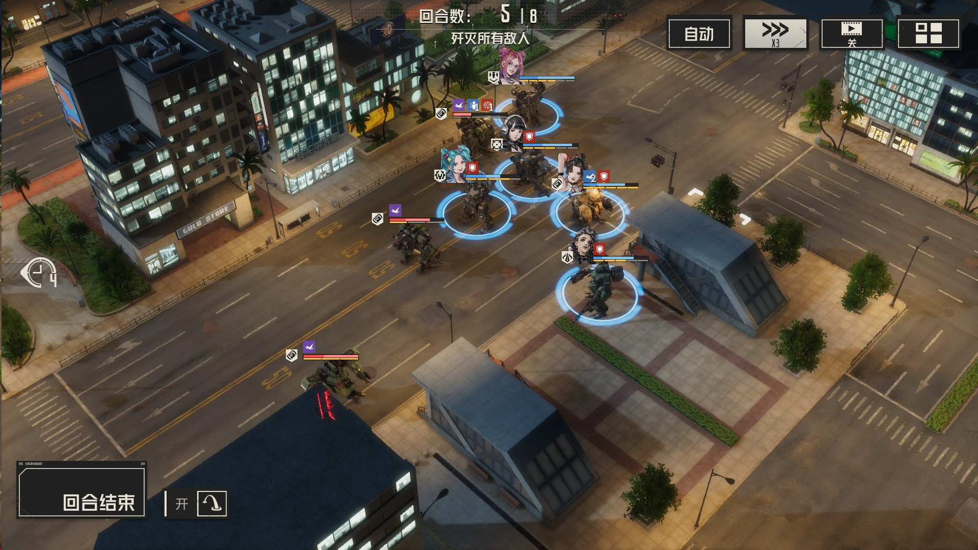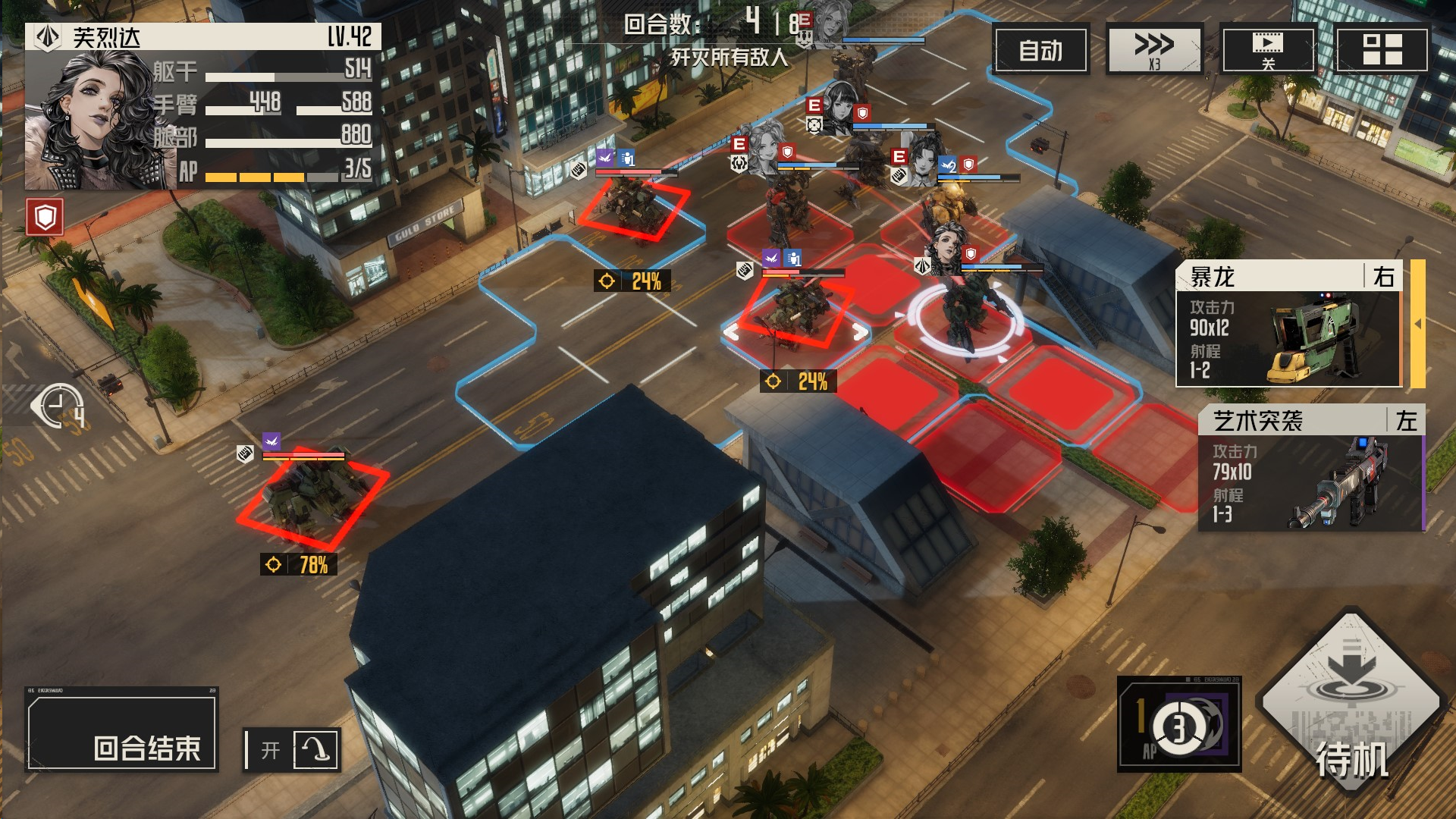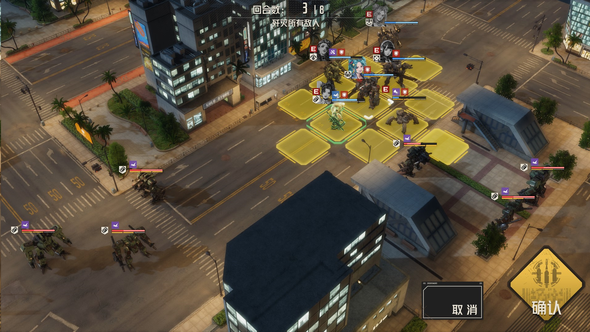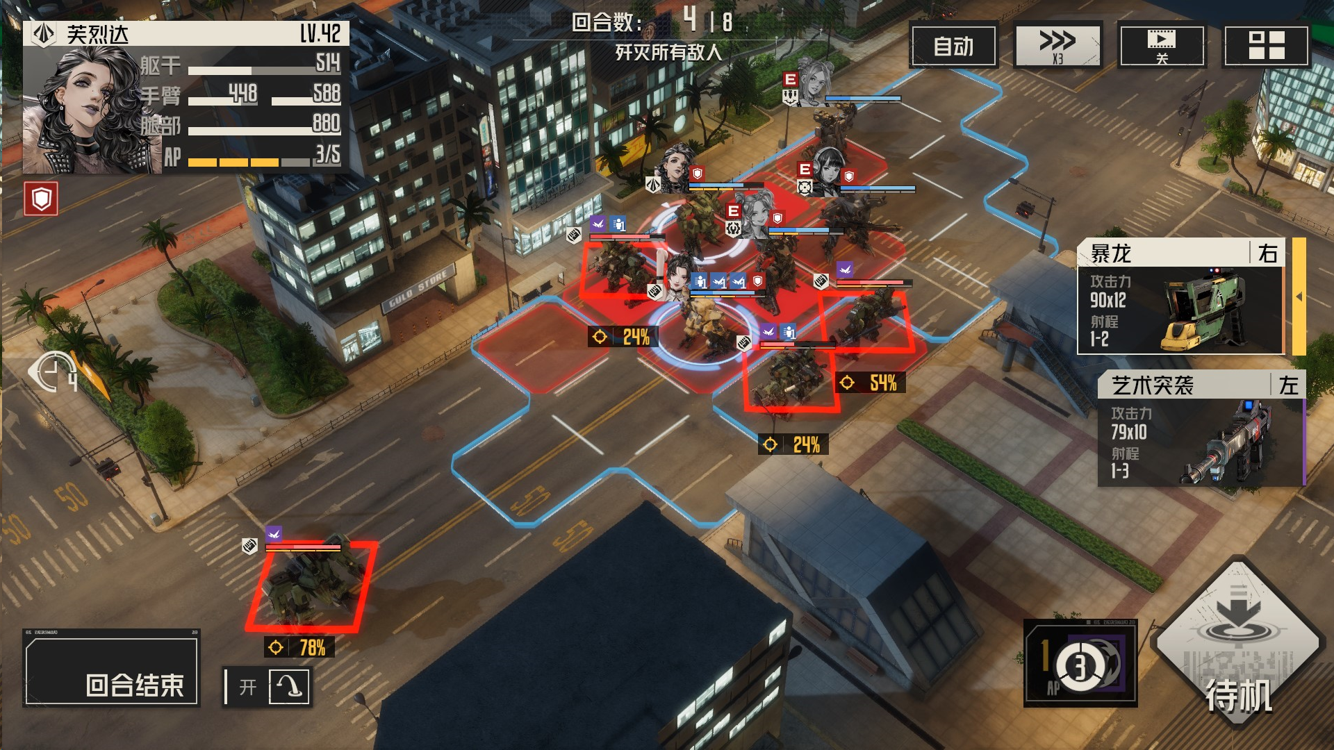 攻击左边敌人,导弹先手,然后其余远程攻击,虹收割,机械师留在最后给虹治疗,消灭敌人的时候,我方尽量不处于周围1圈