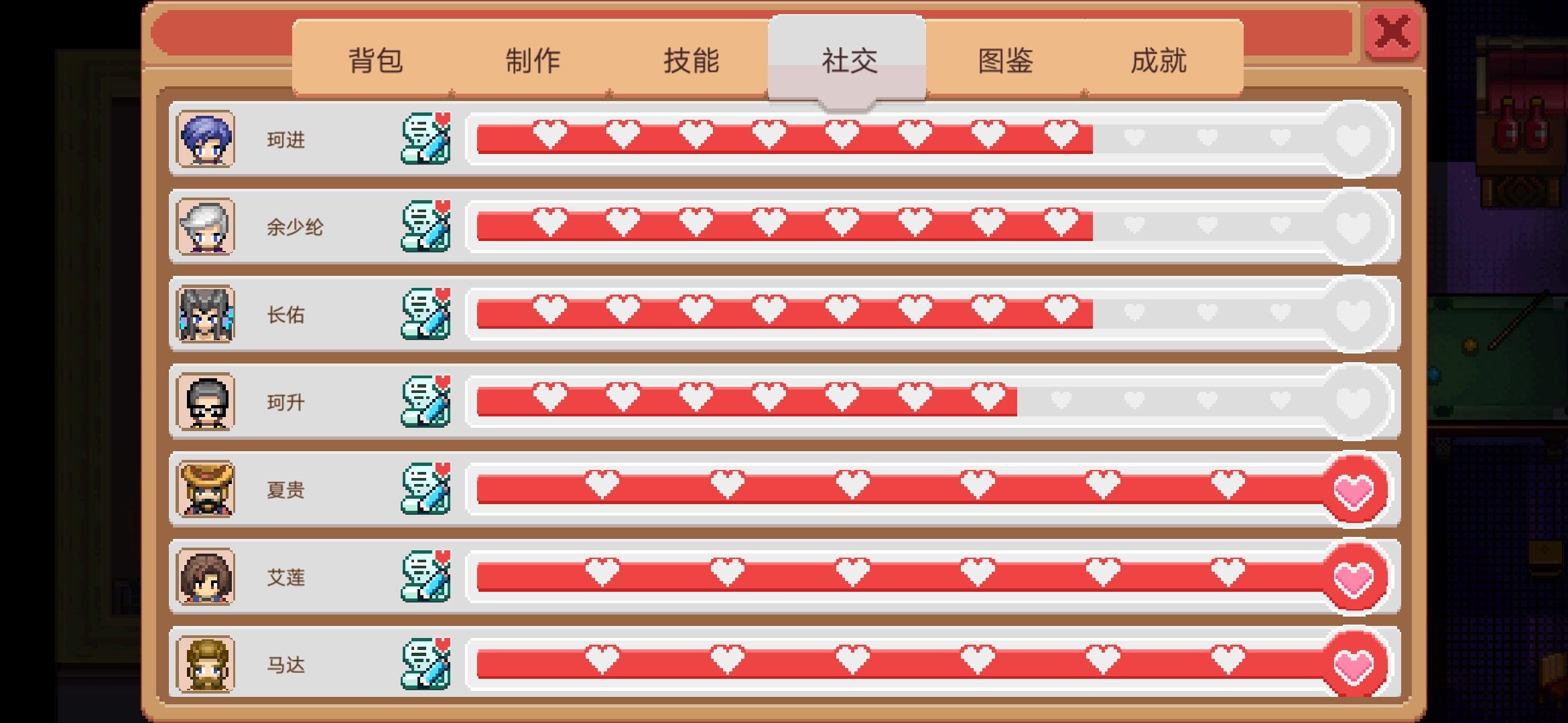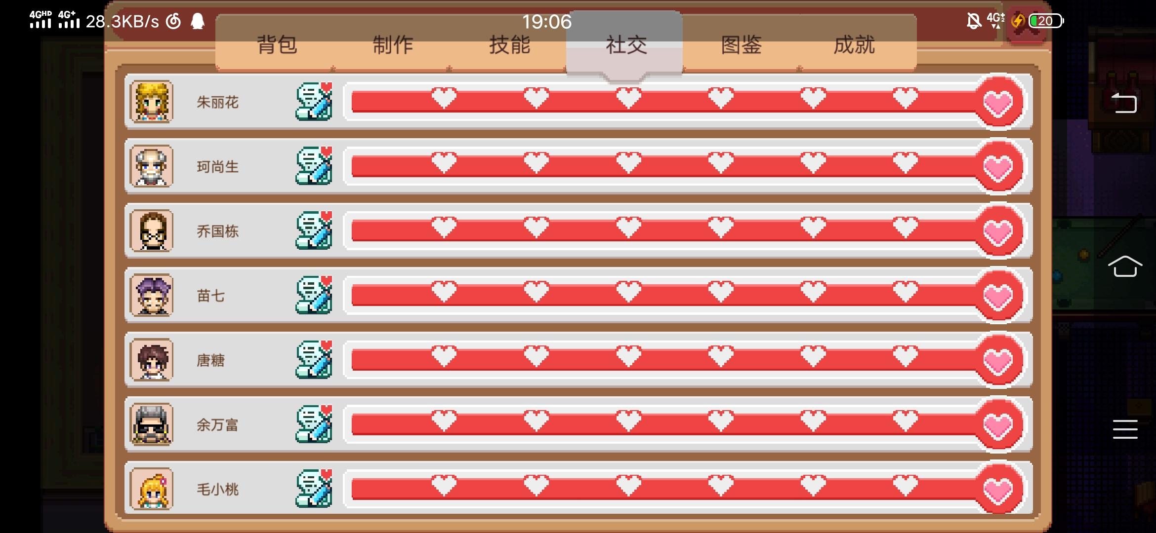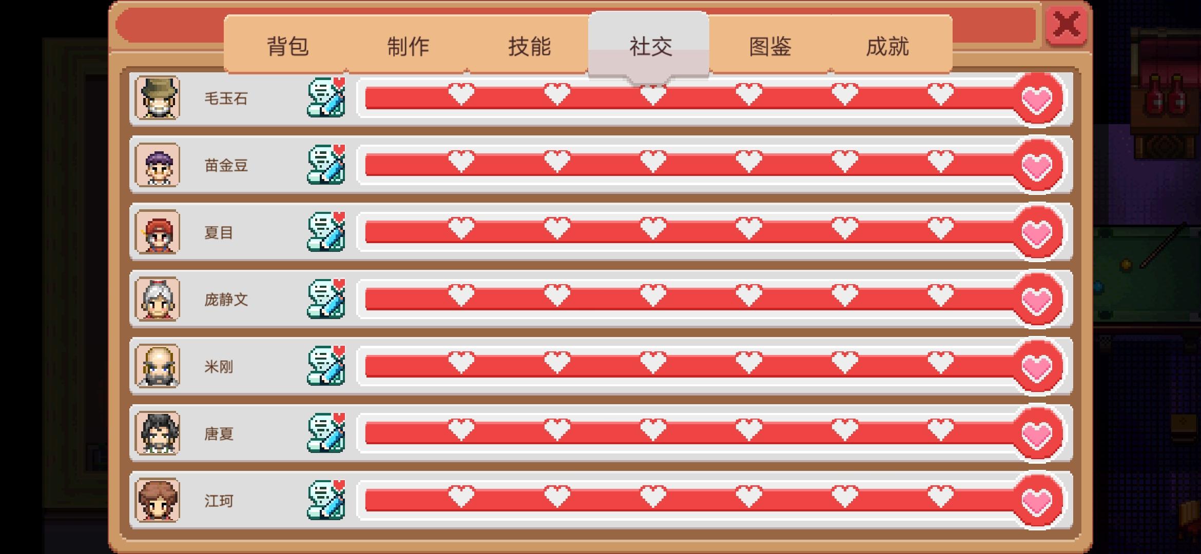 我本来每次身上都会带上npc最喜欢的礼物,然后本来是这样的(看下图)然后还有没有肝满的npc一直在肝,,,,,,,然后改版了,居然所以npc喜欢的物品全改了,我身上带的物品百分之九十用不上了,本来已经背熟了,现在全改了,还要一个一个查着送。还有就是我砸锅卖铁把建筑升满了,然后全部退回去了,我材料一点不剩了