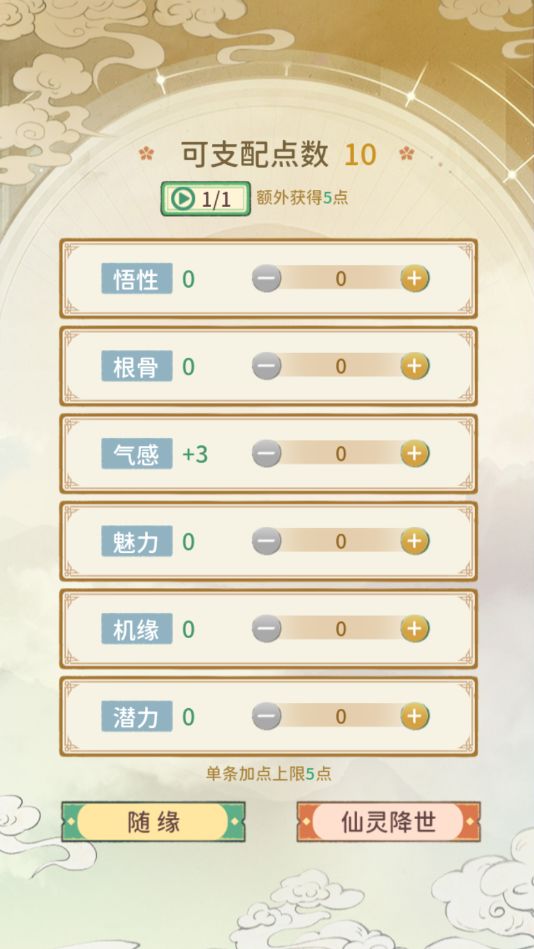 在选择完初始天赋后,我们会有10点可支配点数进行加点,需要注意的是单条属性的最高加点为5点噢。