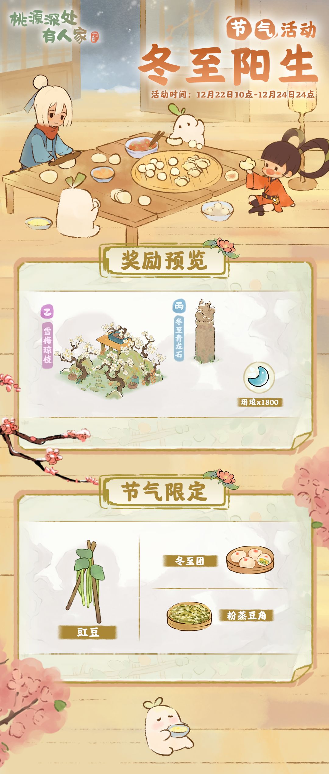 山民在活动期间内,可种植特殊农作物「豇豆」和制作特殊节气菜肴「冬至团」「粉蒸豆角」,提交节气订单可以额外获得玥琅。萝萝山已准备好了本期的节气限定建筑,山民记得参与活动获取玥琅,不要错过兑换时间萝~