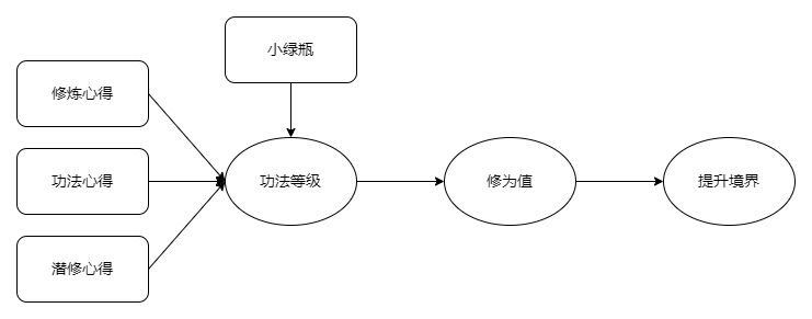 刚掰扯那么多境界(等级)的事,那么游戏里怎么升境界(提升等级)呢?其实很简单!就是【提升功法】!就像真正的修仙者,功法修炼等级越高,我们修为就越高,等修为经验到达一定数量,就可以美美突破境界!