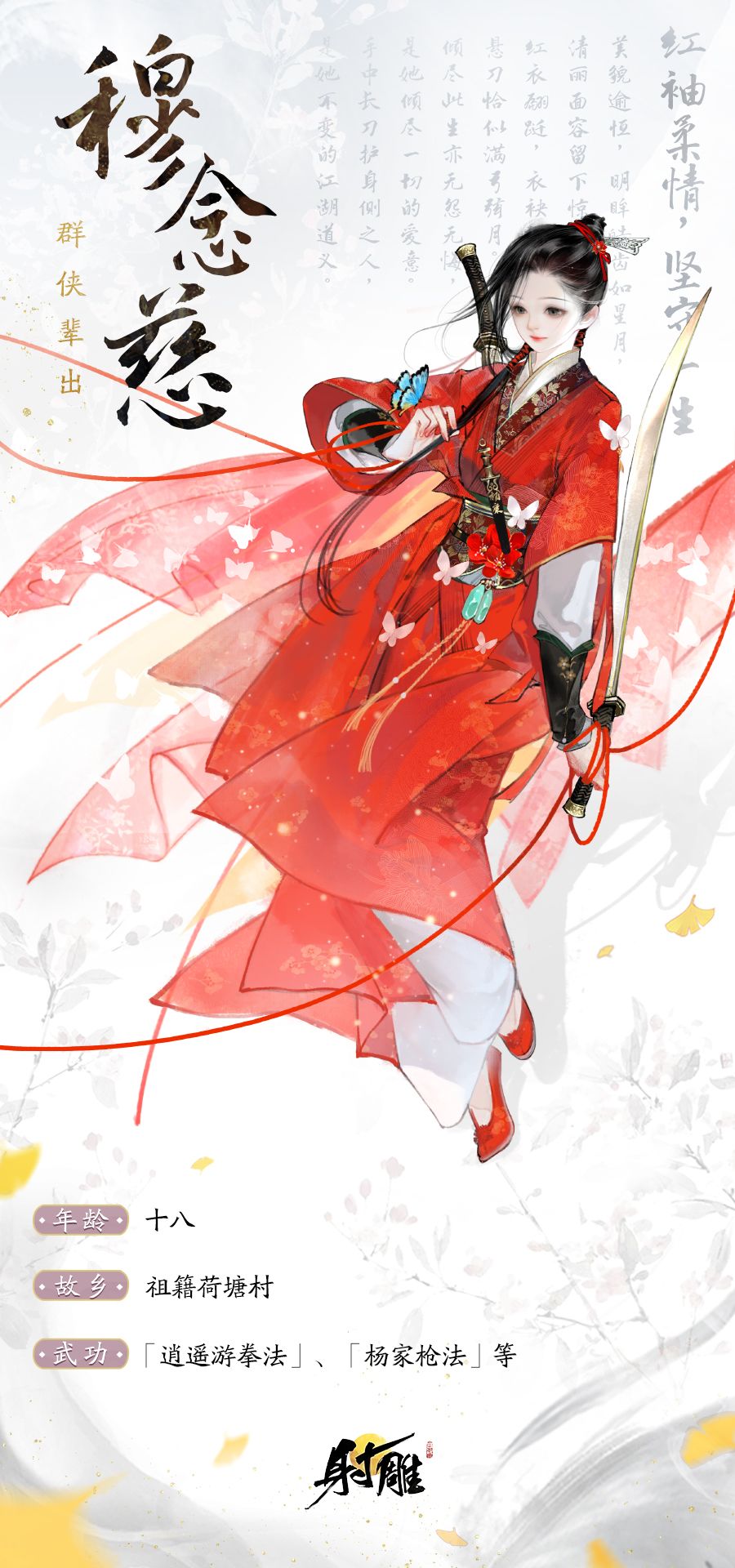 鲜亮红裙上数只蝴蝶翩飞,显出少女的灵动俏丽。以穆念慈与杨康的爱情故事为设计灵感,发间与手腕上均有红线点缀装饰,取“红线错牵”之意。手握柳叶长刀,脚踩红花绣履,腰佩翡翠玉鞋,刚毅的性格和温柔的情意尽在其中。