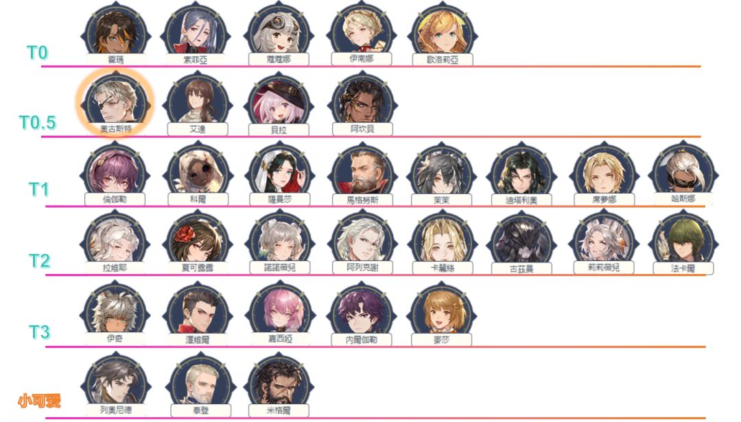 T0.5奥古斯特,版本第一输出,有破盾有破甲,个性是把魔攻加持到物理攻击上并可以再次行动,从你能拿到他开始一直强到60级,搭配霍玛使用,输出能力高于其他角色一个维度。至于为什么不是T0,简单来说奥古从来都是别人配合他没有他配合别人的时候,当卡池人物少的时候,凑出的队伍上限和下限都低(比如索菲娅可以组几个倒吊人杂兵下副本,歌洛也可以组骑士团下副本,奥古组杂兵效果很一般);但随着卡池丰富起来,奥古就是妥妥的三体人,所以这里单独给他一个有颜色的圈圈,抽到了一定要好好培养