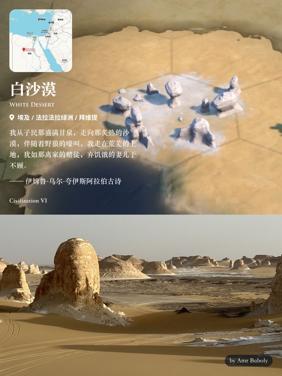 位于开罗西南方三百多公里处的绿洲附近,由数千年沙暴“雕刻”而成的白垩岩石块成群散步在一大片空旷的黄沙漠上。
