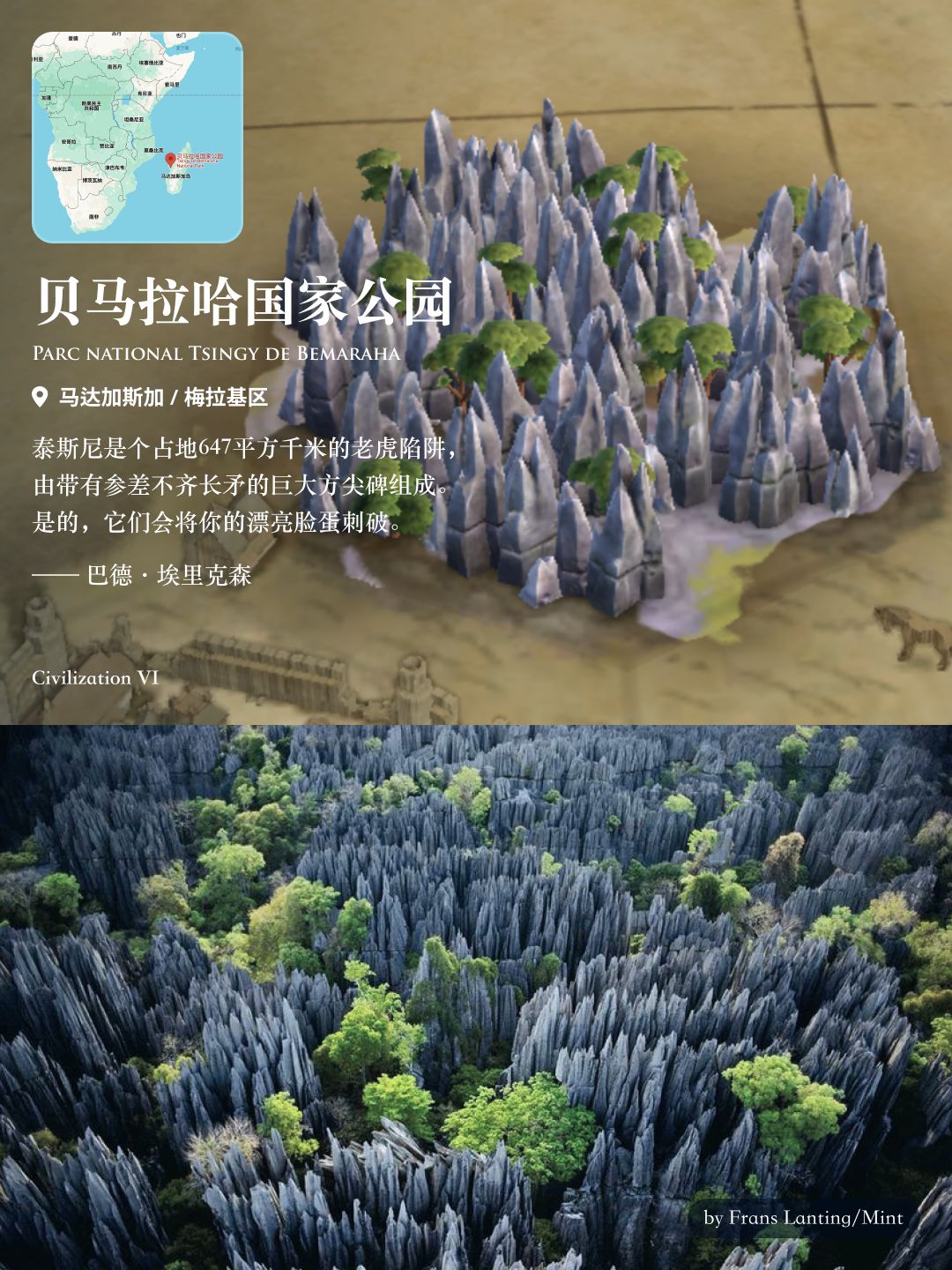 是马达加斯加的国家公园,以喀斯特地貌闻名。公园内充满了坚固、耐旱、锋利、陡峭的石林,千奇百怪,堪称世界上最壮观的岩石结构奇观。