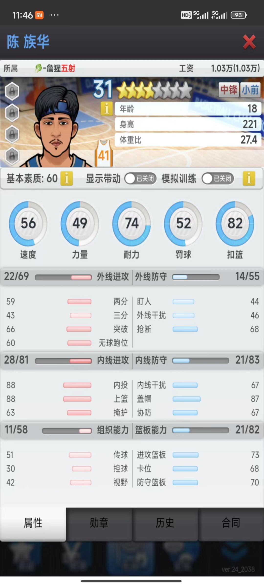 身体:身体一般,打三章速度可以72,力量可以64,不加分但也不太拖后腿吧。