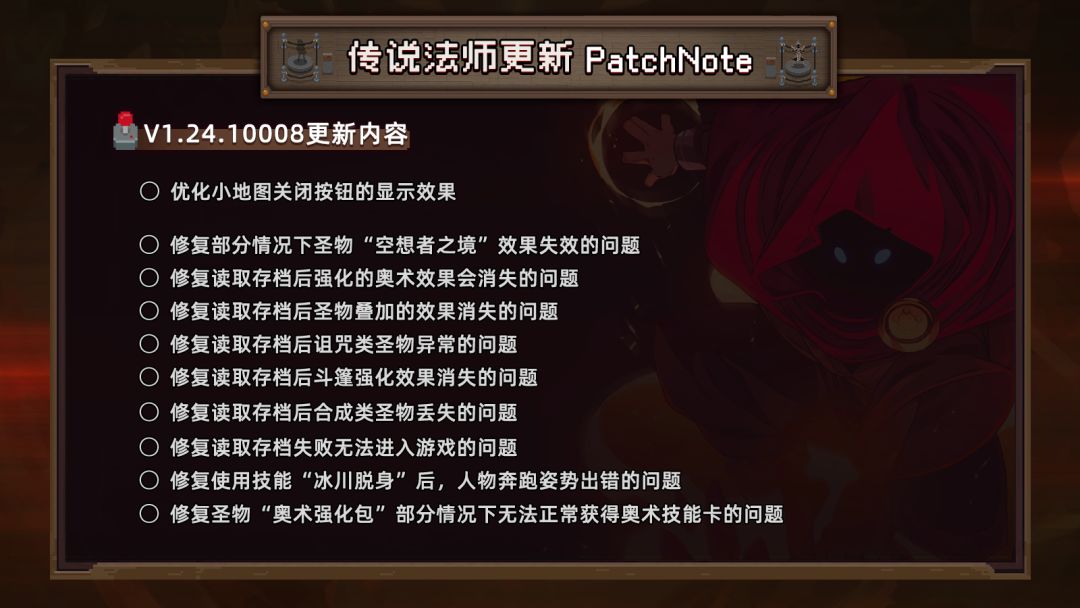 在刚刚推送的更新中,我们主要修复了近期大家反馈比较多的存档读取中出现的问题,包括各种圣物、斗篷、奥术的读取错误,大家可以在此次更新后尝试一下是否有改善。